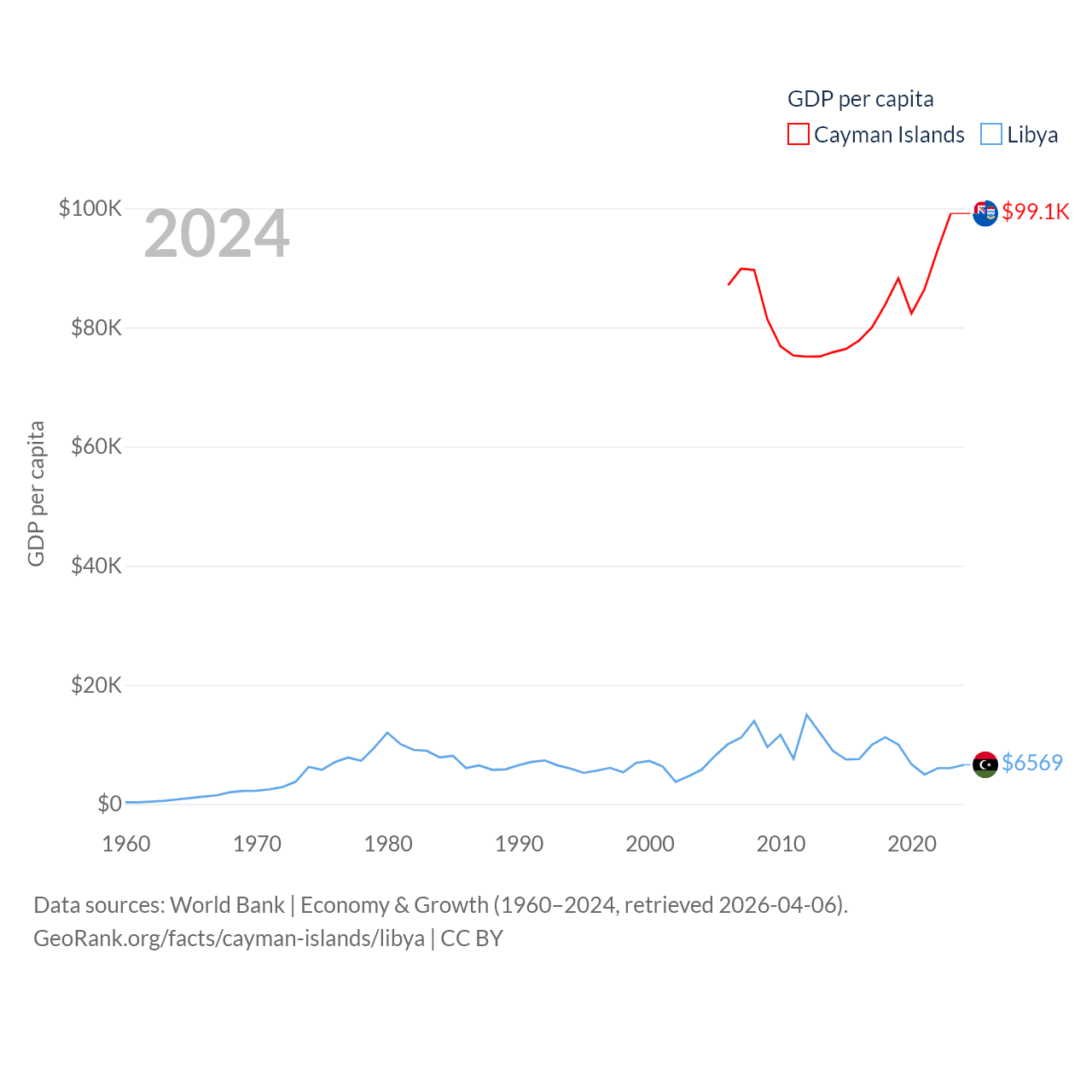 By GDP, The Cayman Islands ranks 158/197 ($7.24B) and Libya ranks 95/197 ($48.5B). By GDP per capita, The Cayman Islands ranks 6/197 ($99,144), while Libya ranks 107/197 ($6,569).