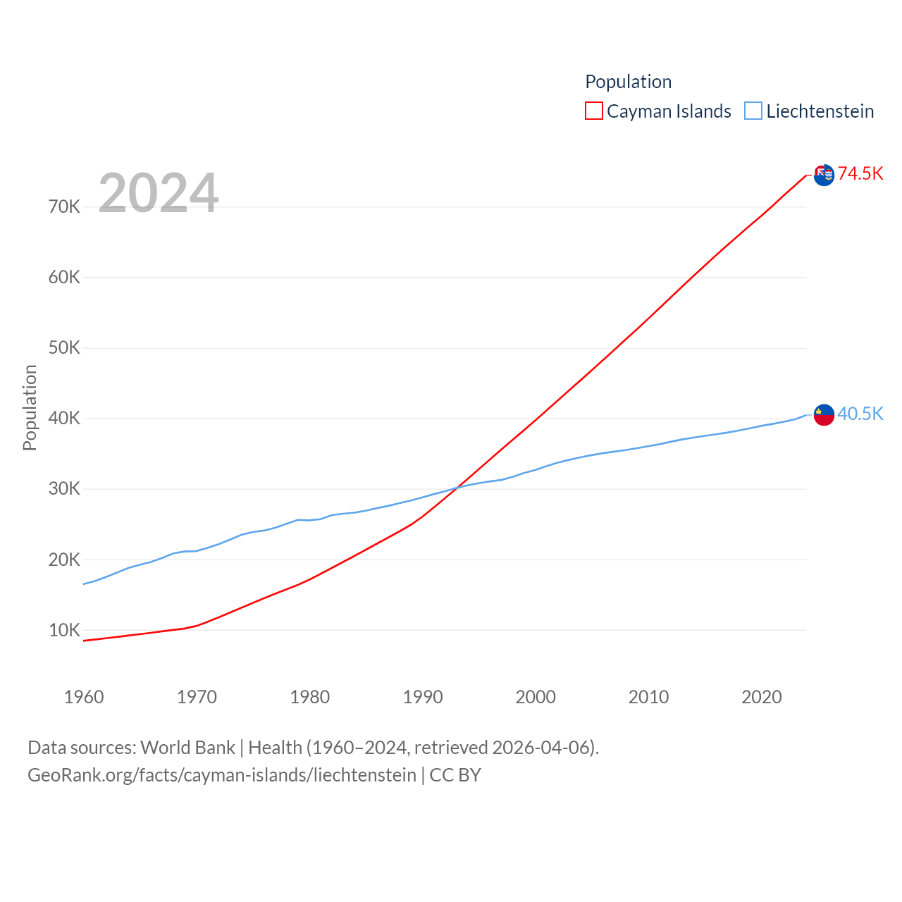 The Cayman Islands has a population of 74.5K (ranked 187/197), compared with 40.4K in Liechtenstein (ranked 190/197). The Cayman Islands' land area is 92.7 sq mi versus 61.8 sq mi for Liechtenstein (ranked 190th vs. 192nd).