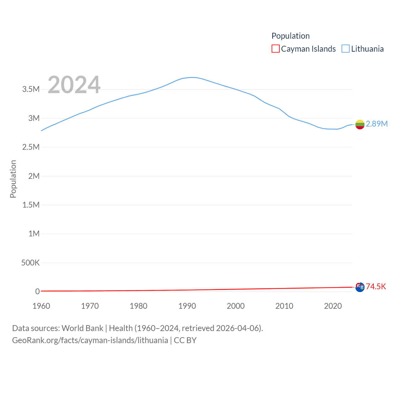 The Cayman Islands has a population of 74.5K (ranked 187/197), compared with 2.89M in Lithuania (ranked 137/197). The Cayman Islands' land area is 92.7 sq mi versus 24,170 sq mi for Lithuania (ranked 190th vs. 120th).