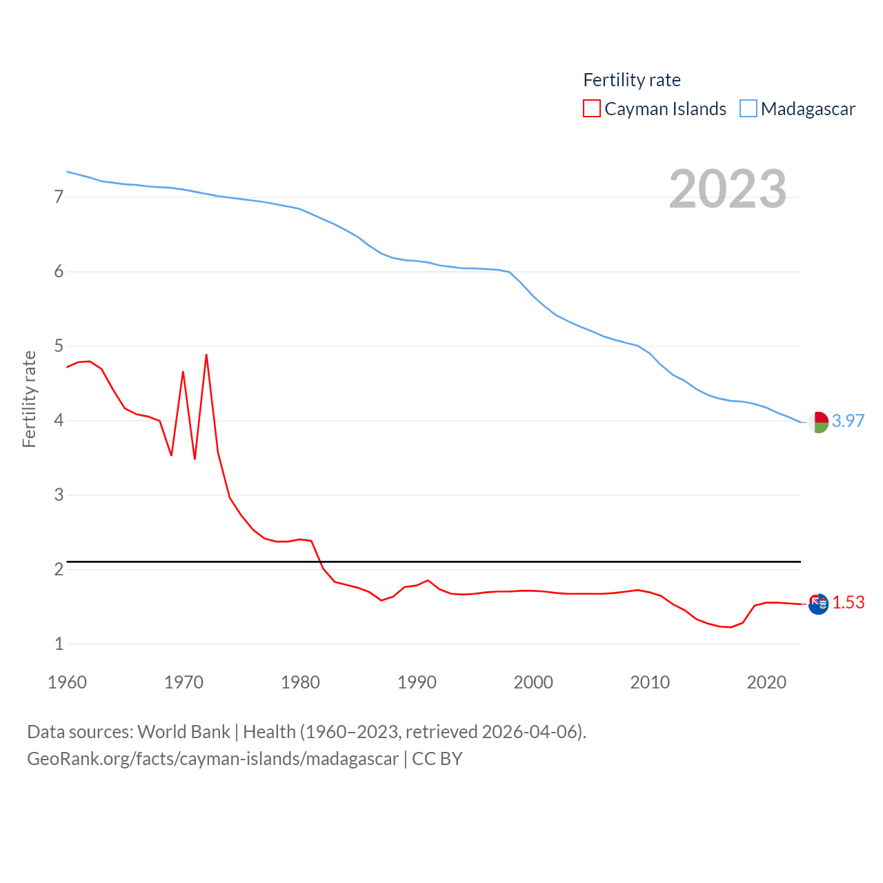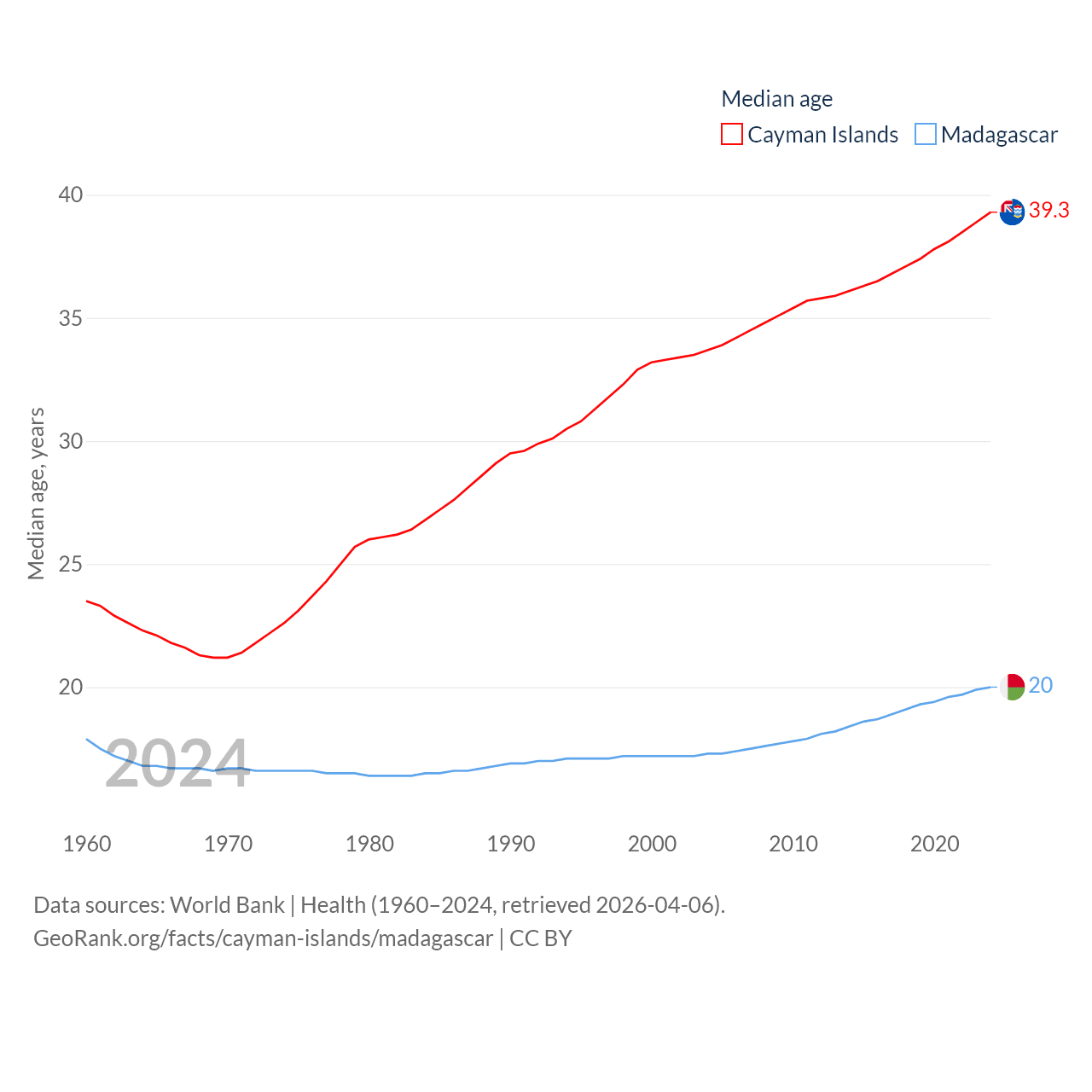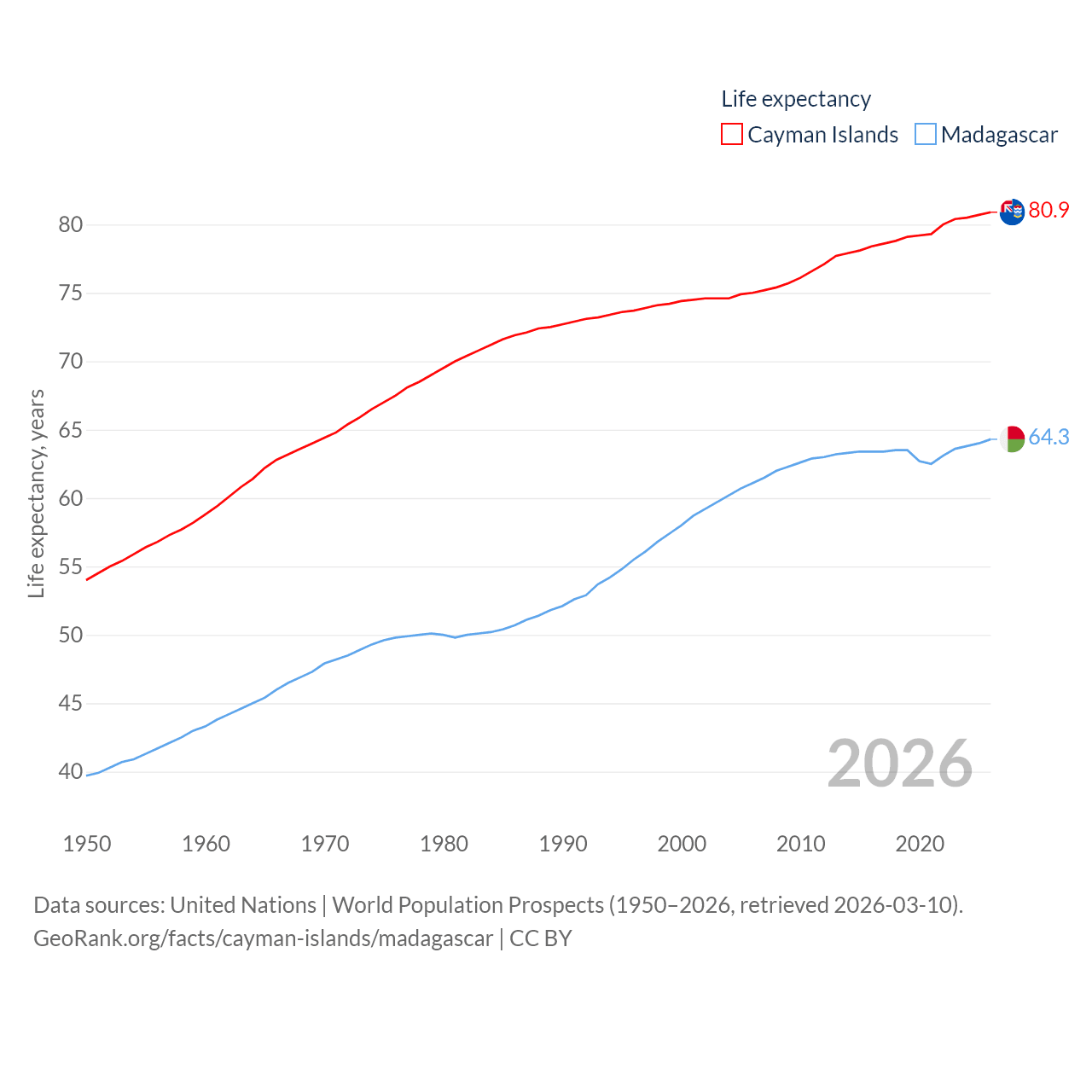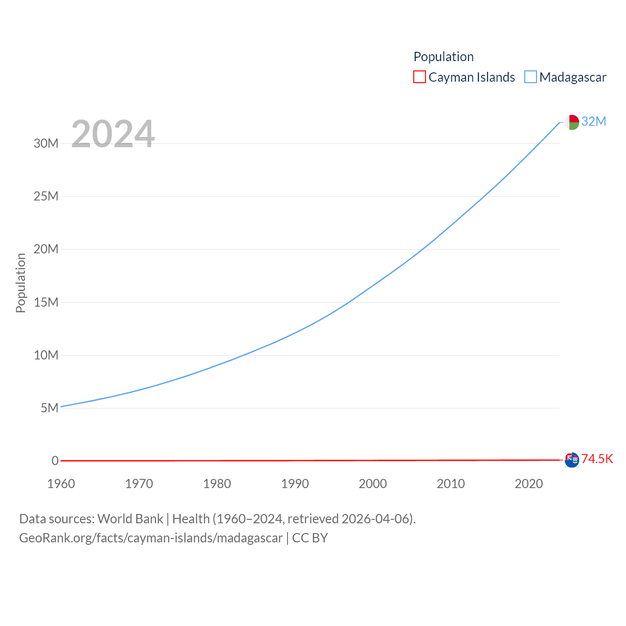 The Cayman Islands has a population of 74.5K (ranked 187/197), compared with 32M in Madagascar (ranked 49/197). The Cayman Islands' land area is 92.7 sq mi versus 224,634 sq mi for Madagascar (ranked 190th vs. 44th).