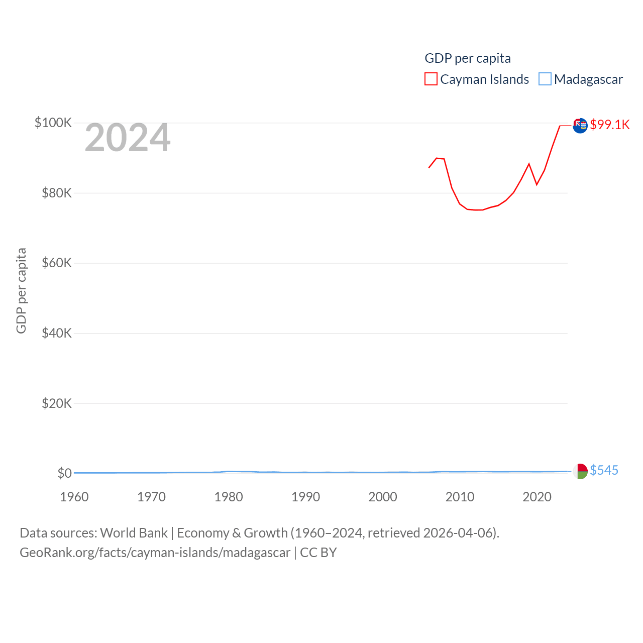 By GDP, The Cayman Islands ranks 158/197 ($7.24B) and Madagascar ranks 136/197 ($17.4B). By GDP per capita, The Cayman Islands ranks 6/197 ($99,144), while Madagascar ranks 193/197 ($545).