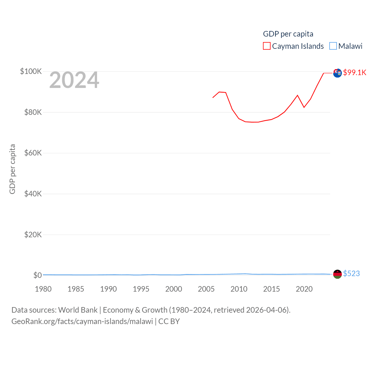 By GDP, The Cayman Islands ranks 158/197 ($7.24B) and Malawi ranks 151/197 ($11.3B). By GDP per capita, The Cayman Islands ranks 6/197 ($99,144), while Malawi ranks 194/197 ($523).
