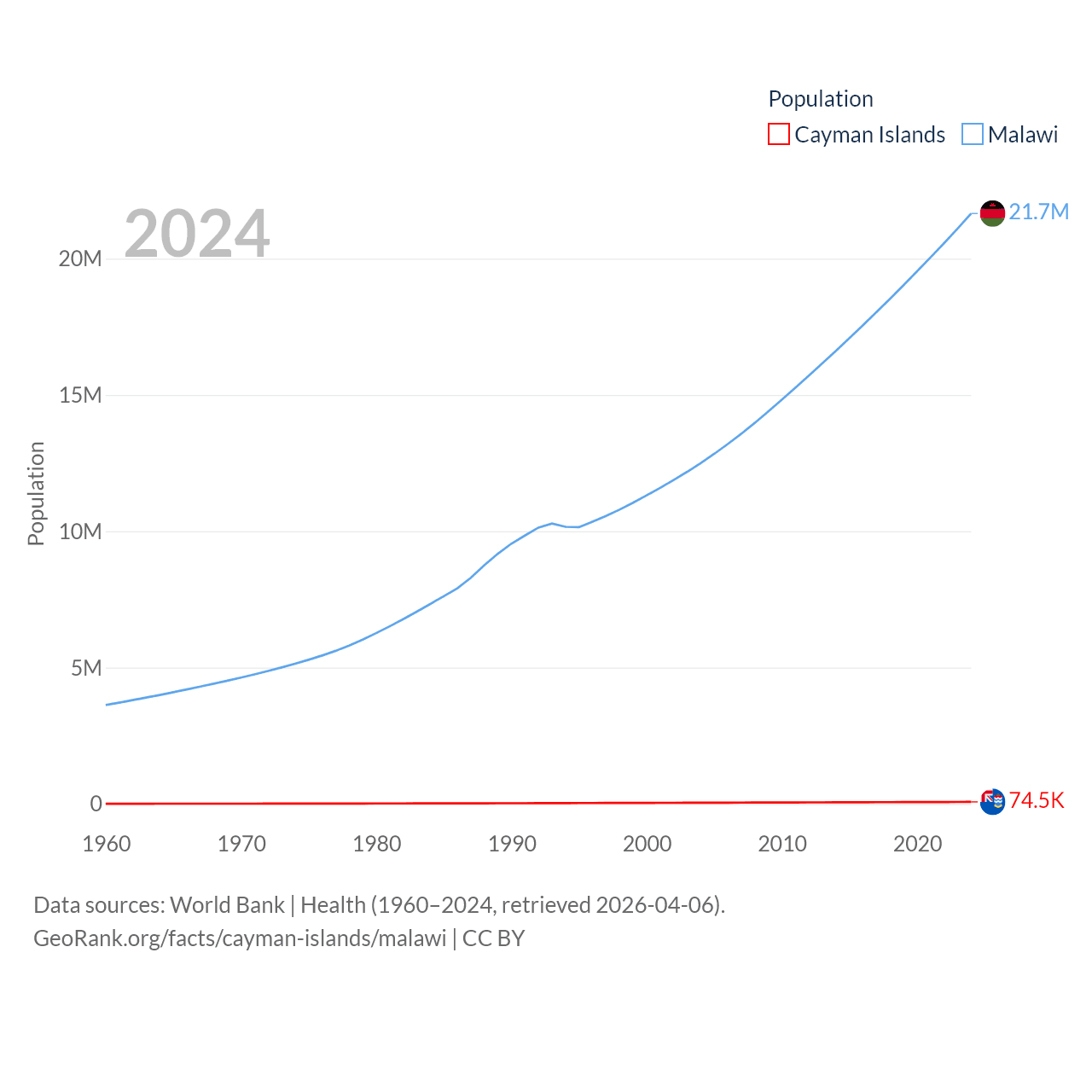 The Cayman Islands has a population of 74.5K (ranked 187/197), compared with 21.7M in Malawi (ranked 62/197). The Cayman Islands' land area is 92.7 sq mi versus 36,402 sq mi for Malawi (ranked 190th vs. 107th).