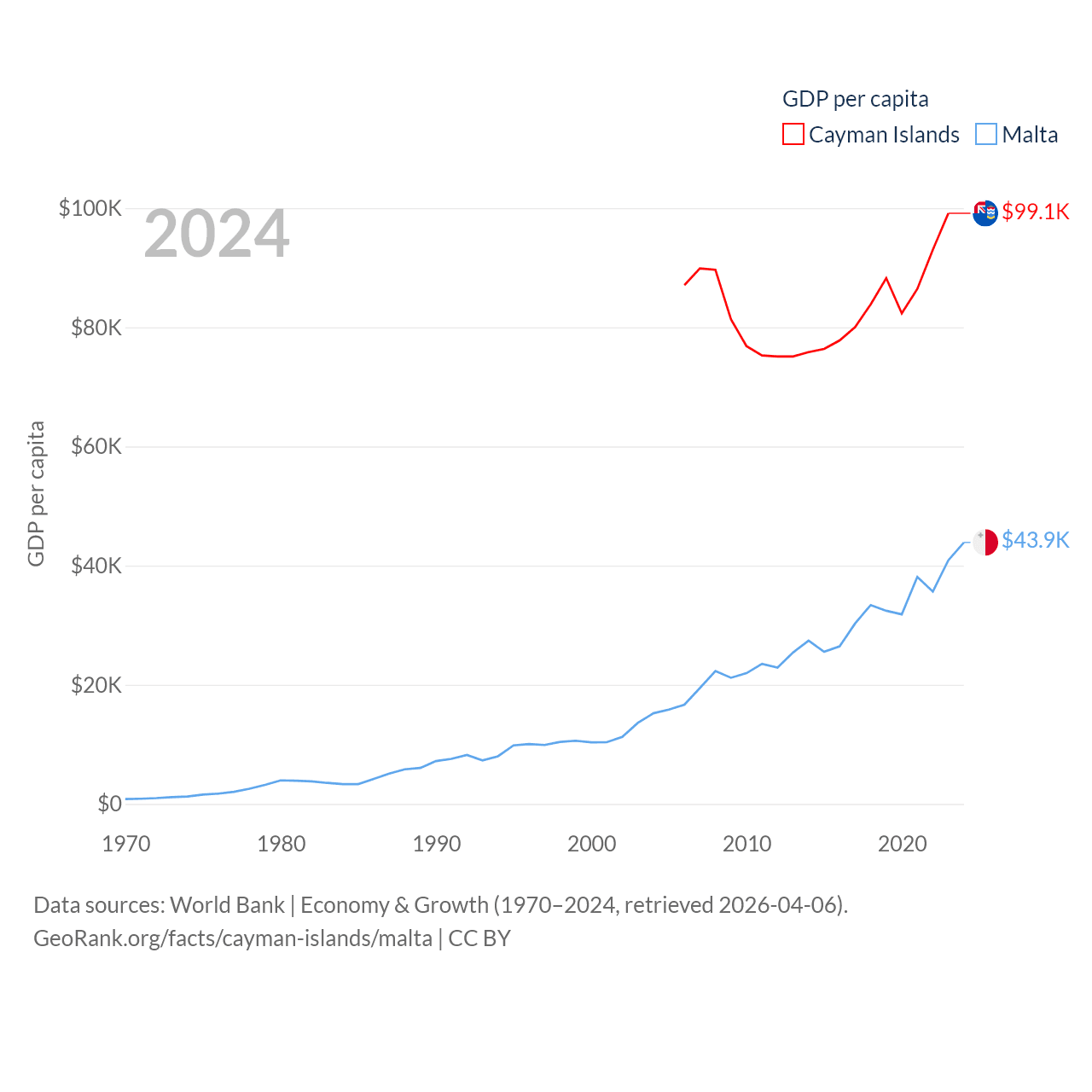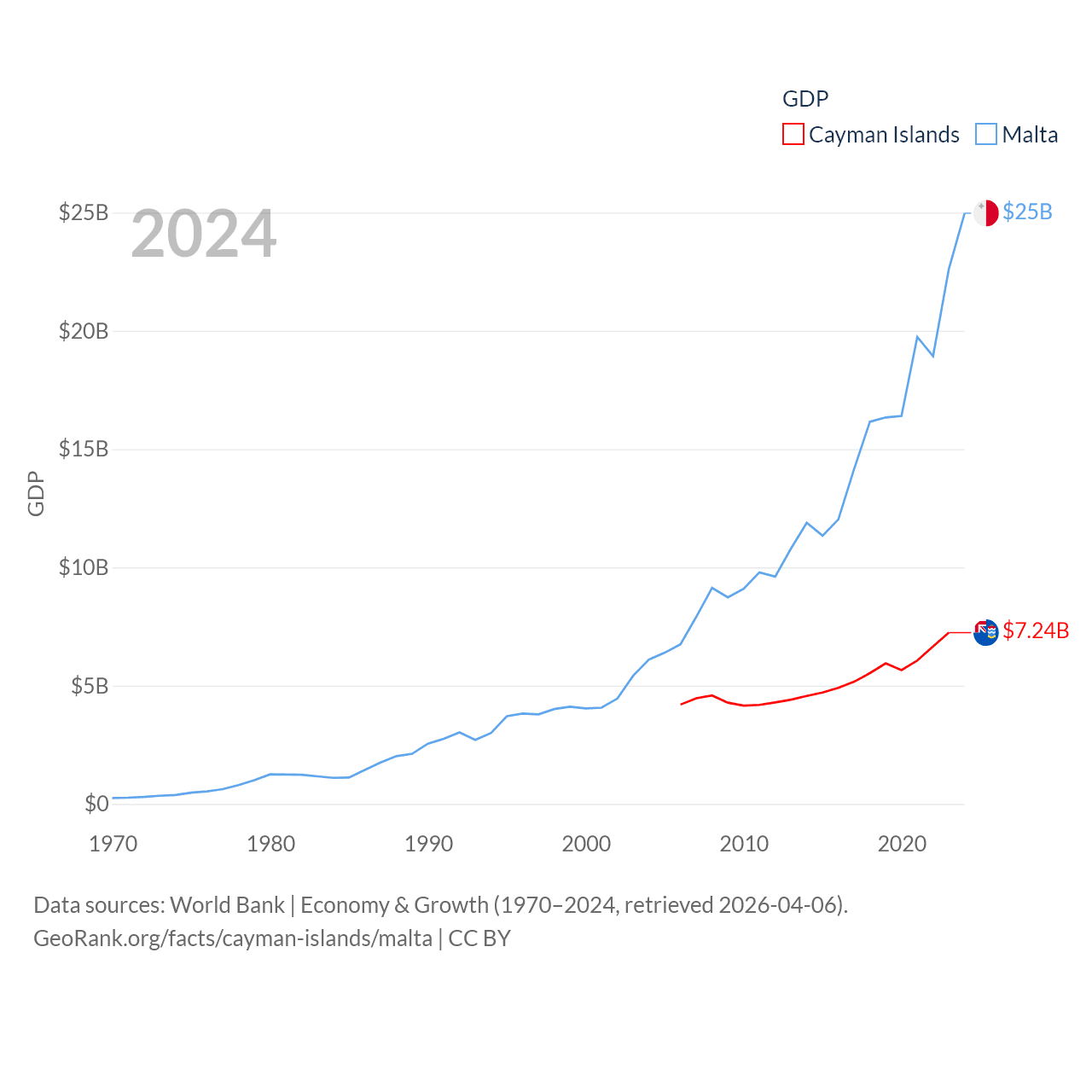By GDP, The Cayman Islands ranks 158/197 ($7.24B) and Malta ranks 119/197 ($25B). By GDP per capita, The Cayman Islands ranks 6/197 ($99,144), while Malta ranks 28/197 ($43,899).
