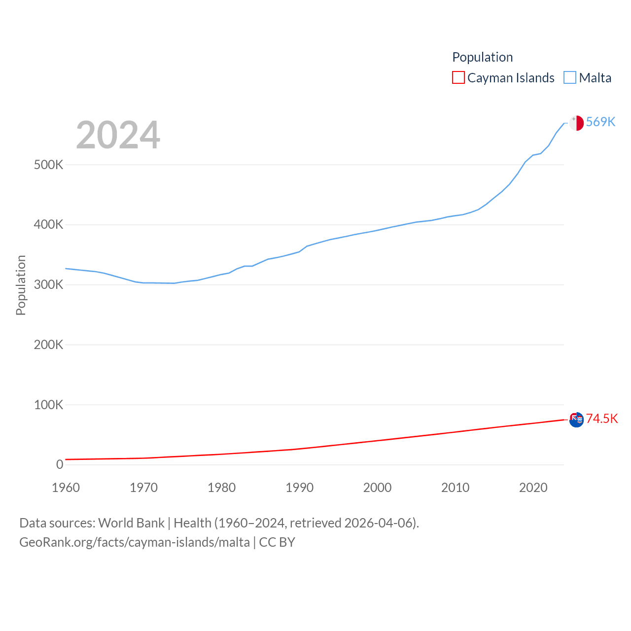 The Cayman Islands has a population of 74.5K (ranked 187/197), compared with 569K in Malta (ranked 167/197). The Cayman Islands' land area is 92.7 sq mi versus 123.6 sq mi for Malta (ranked 190th vs. 187th).