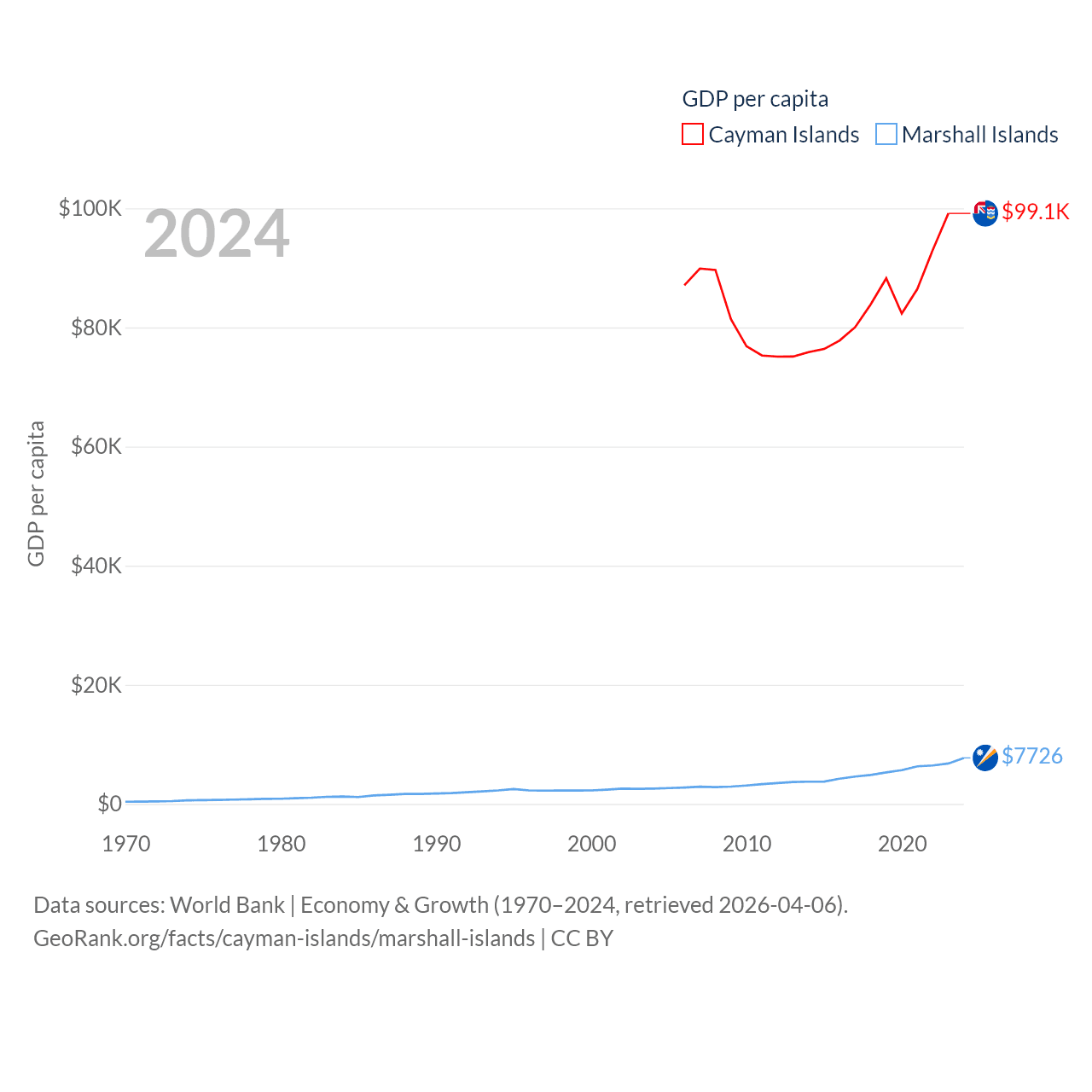 By GDP, The Cayman Islands ranks 158/197 ($7.24B) and The Marshall Islands ranks 193/197 ($290M). By GDP per capita, The Cayman Islands ranks 6/197 ($99,144), while The Marshall Islands ranks 96/197 ($7,726).