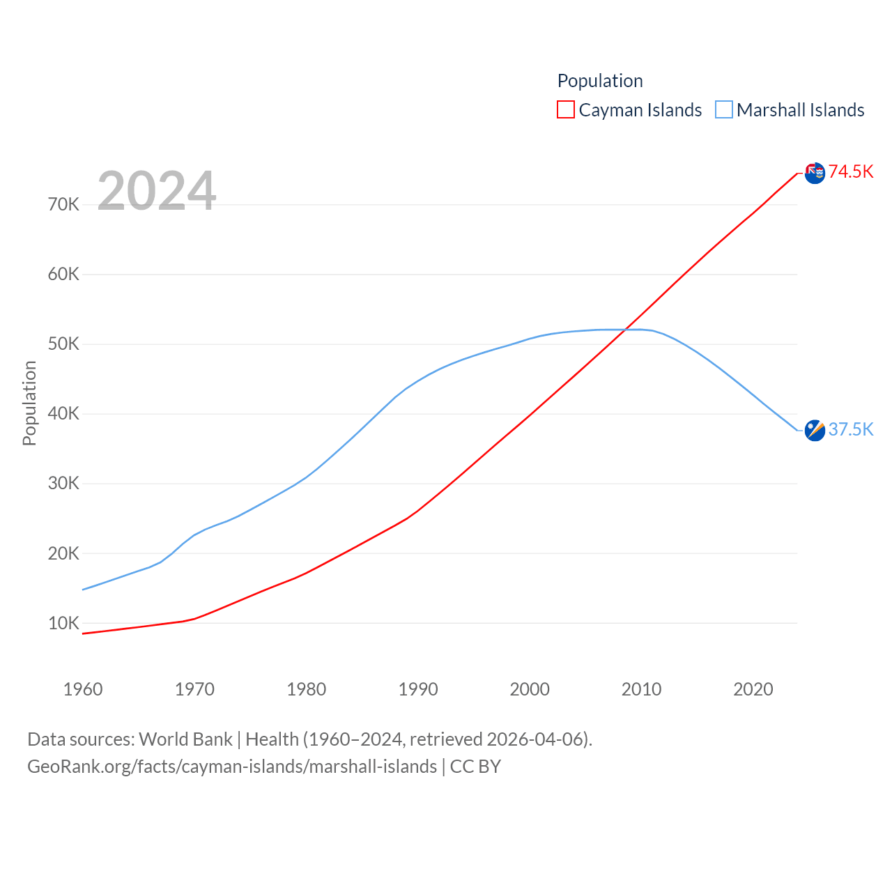The Cayman Islands has a population of 74.5K (ranked 187/197), compared with 37.5K in The Marshall Islands (ranked 192/197). The Cayman Islands' land area is 92.7 sq mi versus 69.5 sq mi for The Marshall Islands (ranked 190th vs. 191st).
