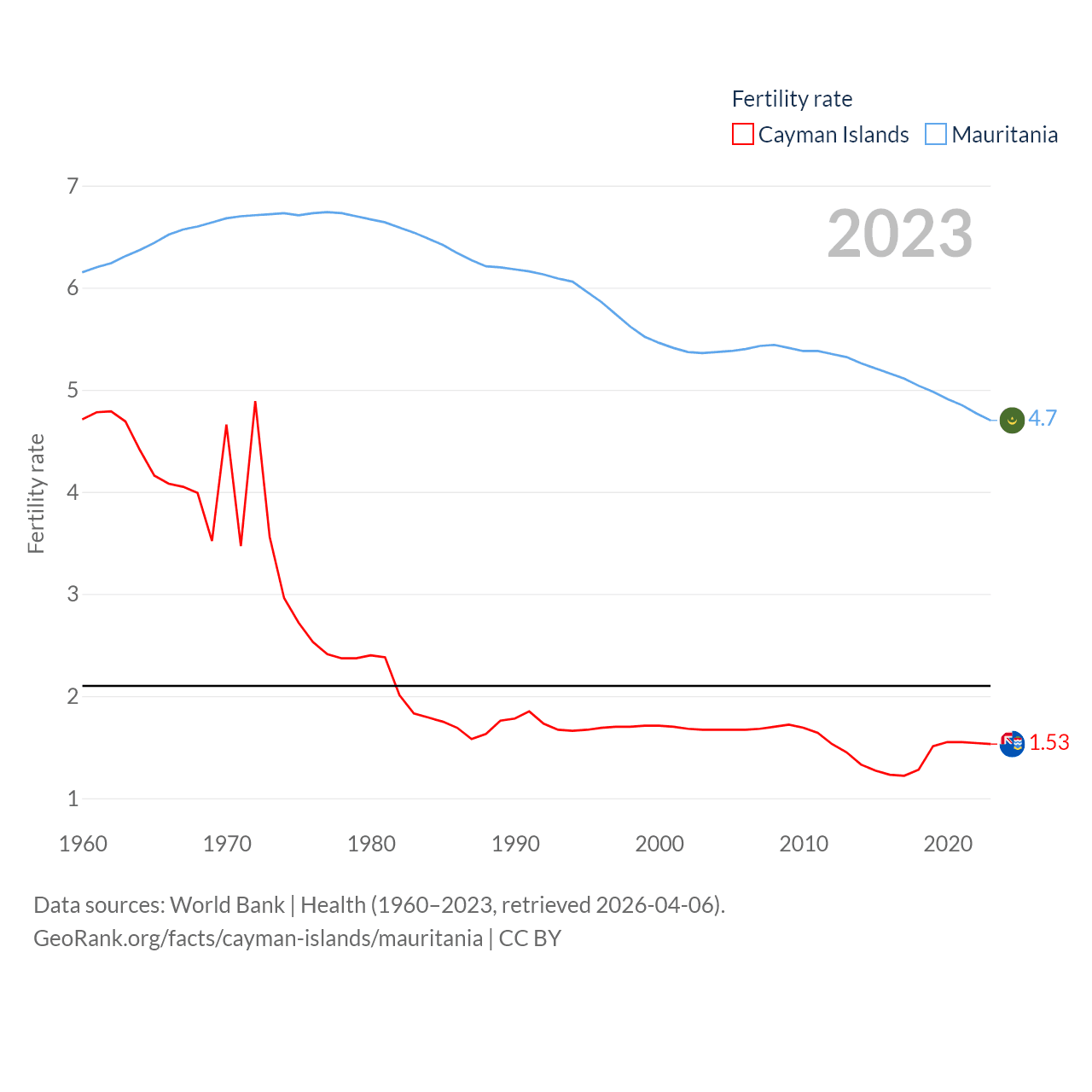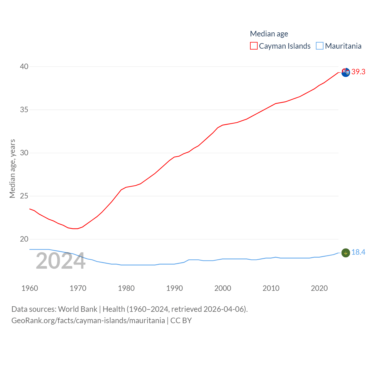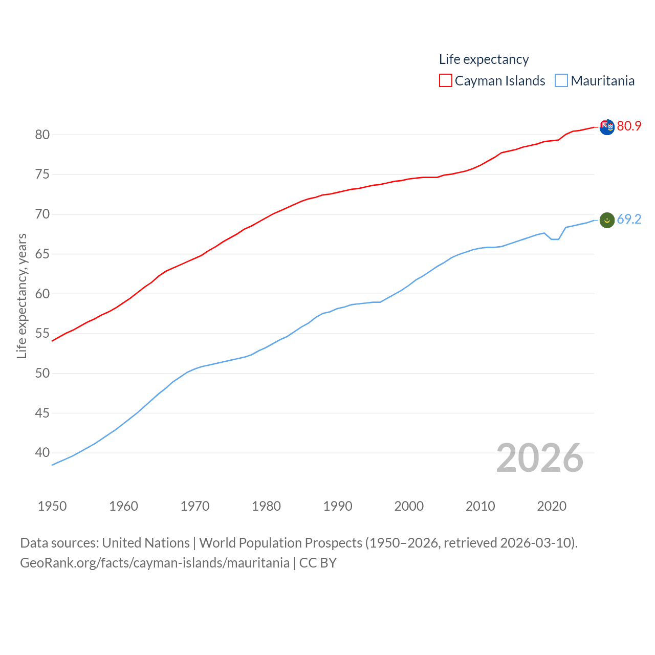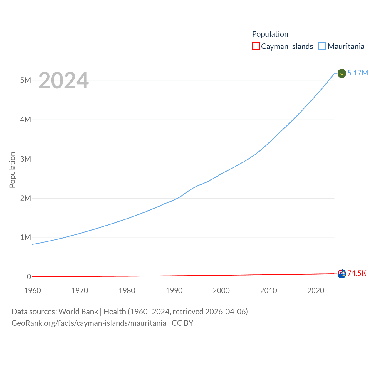 The Cayman Islands has a population of 74.5K (ranked 187/197), compared with 5.17M in Mauritania (ranked 125/197). The Cayman Islands' land area is 92.7 sq mi versus 397,955 sq mi for Mauritania (ranked 190th vs. 28th).