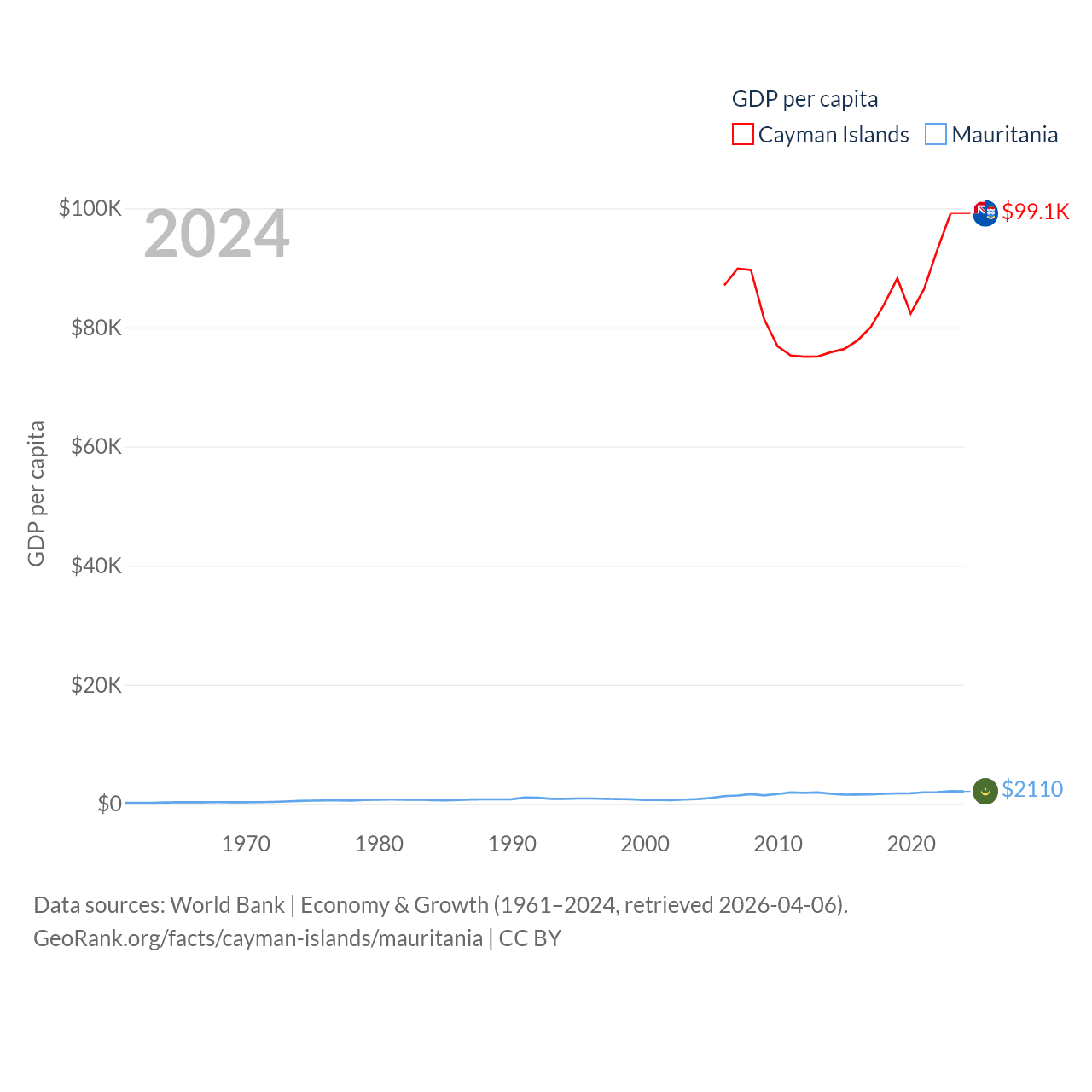 By GDP, The Cayman Islands ranks 158/197 ($7.24B) and Mauritania ranks 153/197 ($10.9B). By GDP per capita, The Cayman Islands ranks 6/197 ($99,144), while Mauritania ranks 156/197 ($2,110).