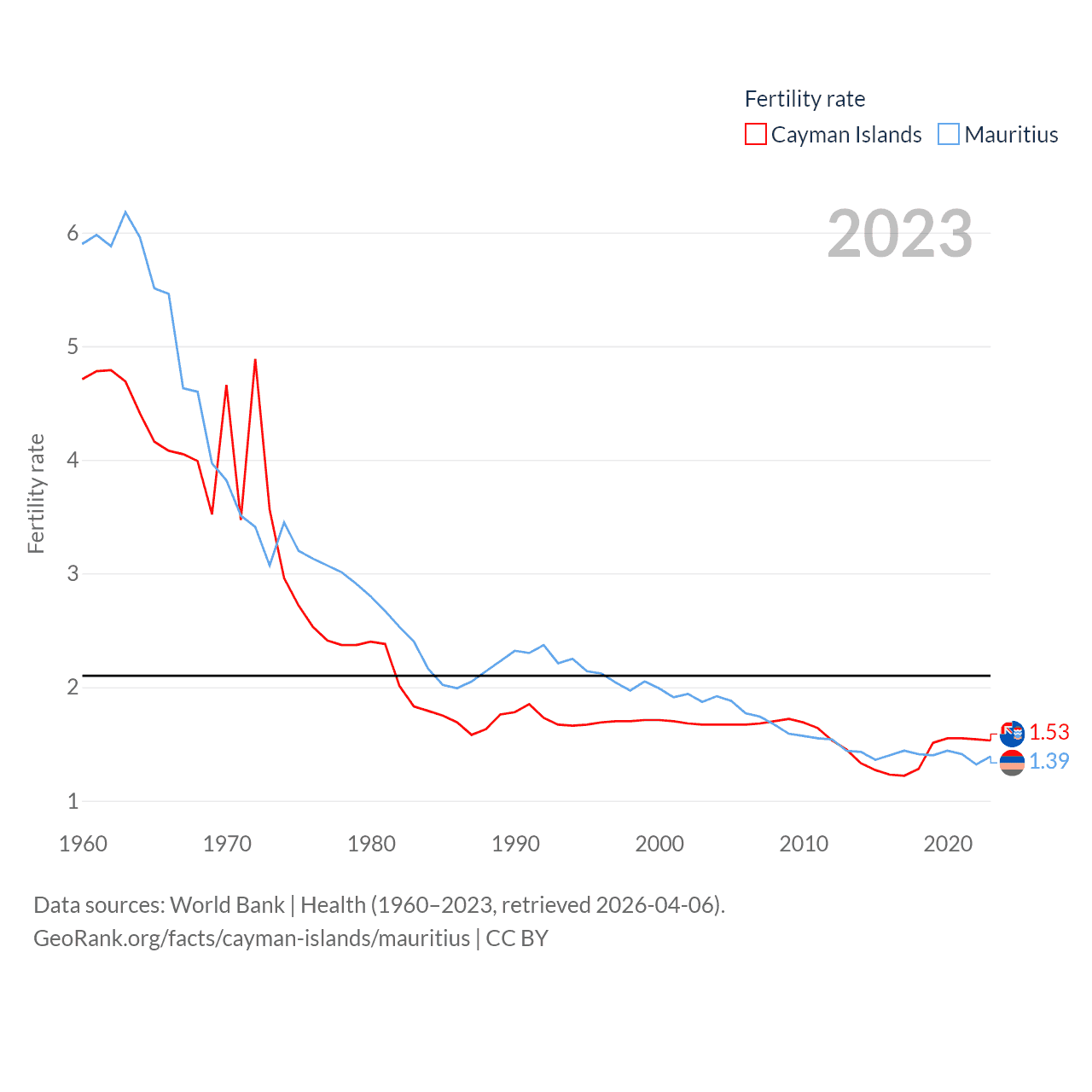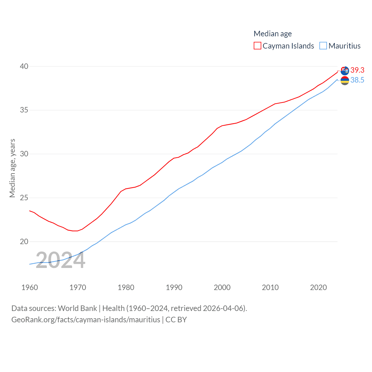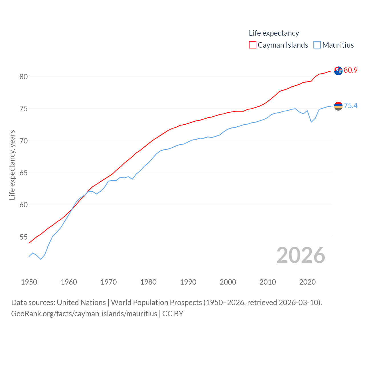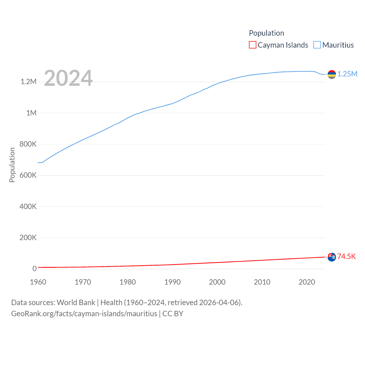 The Cayman Islands has a population of 74.5K (ranked 187/197), compared with 1.25M in Mauritius (ranked 156/197). The Cayman Islands' land area is 92.7 sq mi versus 771 sq mi for Mauritius (ranked 190th vs. 170th).