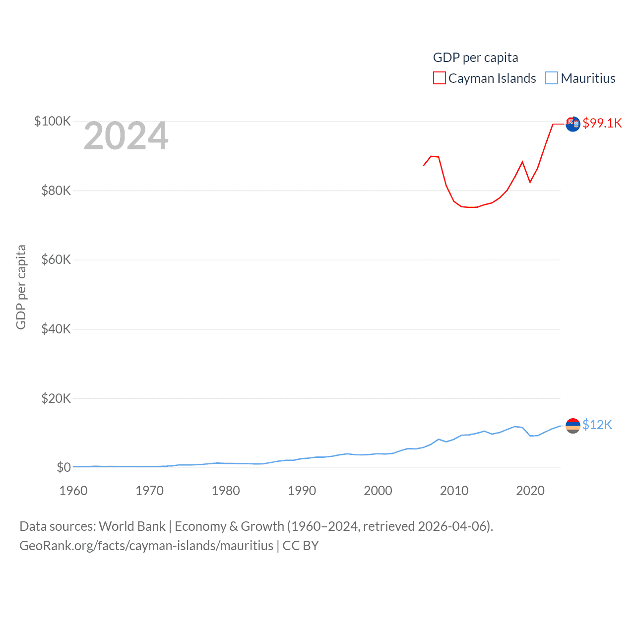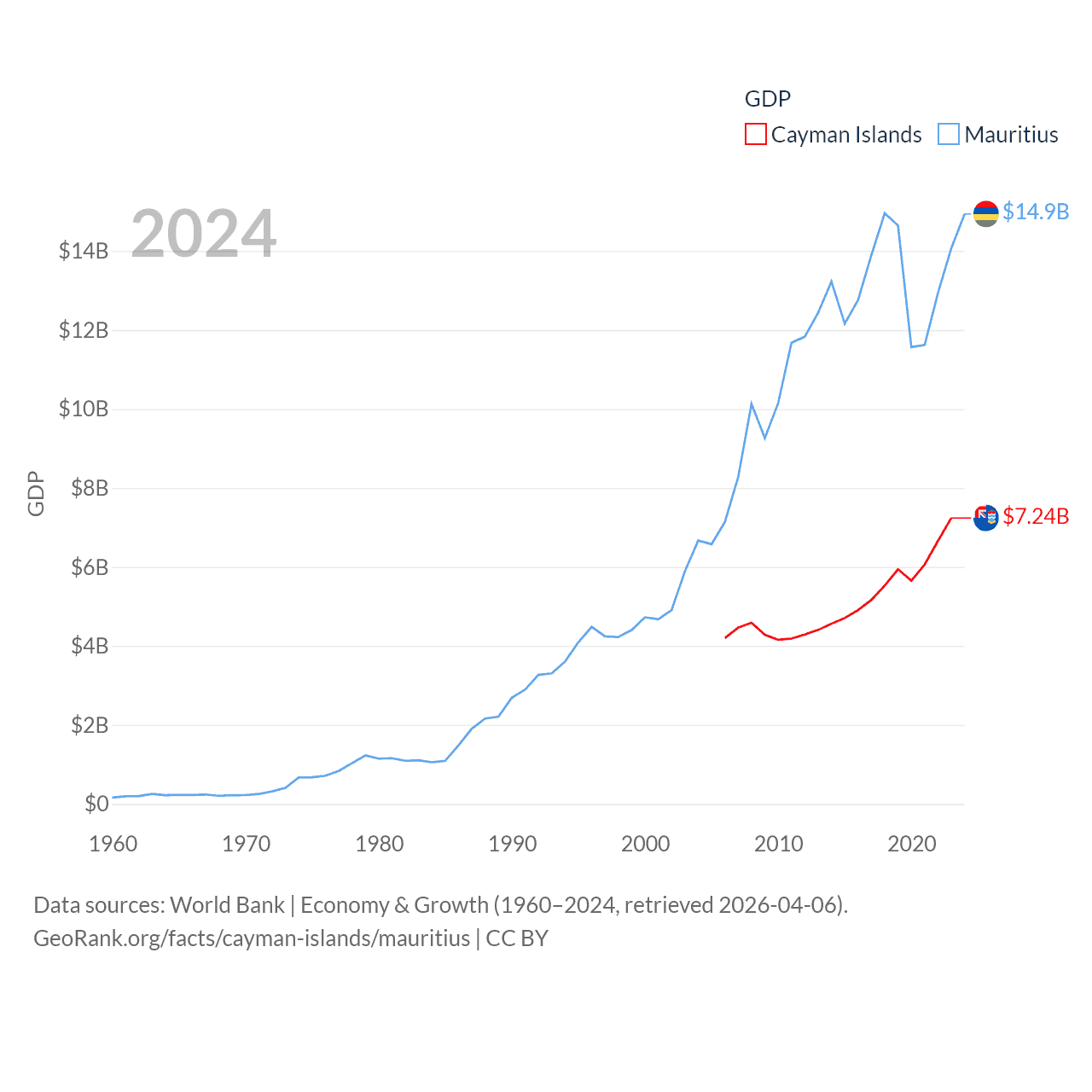By GDP, The Cayman Islands ranks 158/197 ($7.24B) and Mauritius ranks 143/197 ($14.9B). By GDP per capita, The Cayman Islands ranks 6/197 ($99,144), while Mauritius ranks 78/197 ($11,991).