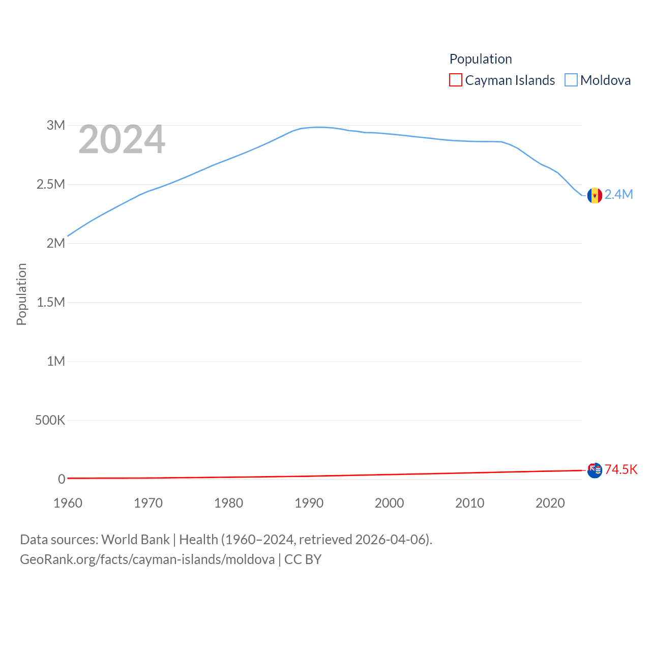 The Cayman Islands has a population of 74.5K (ranked 187/197), compared with 2.4M in Moldova (ranked 143/197). The Cayman Islands' land area is 92.7 sq mi versus 12,714 sq mi for Moldova (ranked 190th vs. 135th).