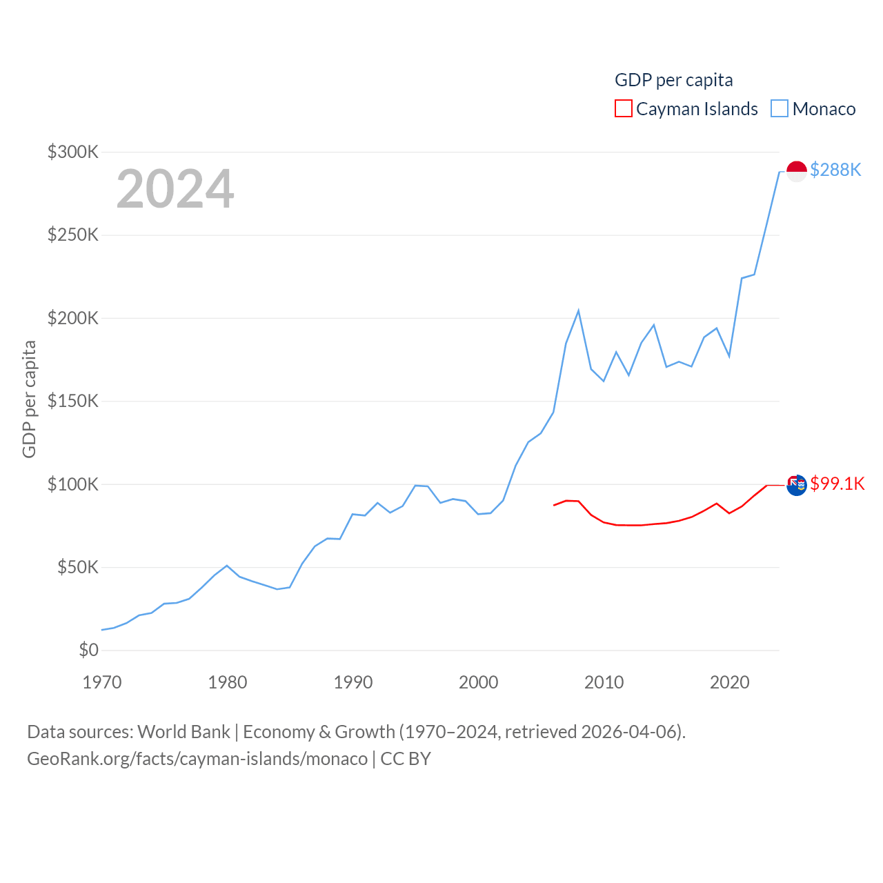 By GDP, The Cayman Islands ranks 158/197 ($7.24B) and Monaco ranks 152/197 ($11.1B). By GDP per capita, The Cayman Islands ranks 6/197 ($99,144), while Monaco ranks 1/197 ($288,001).