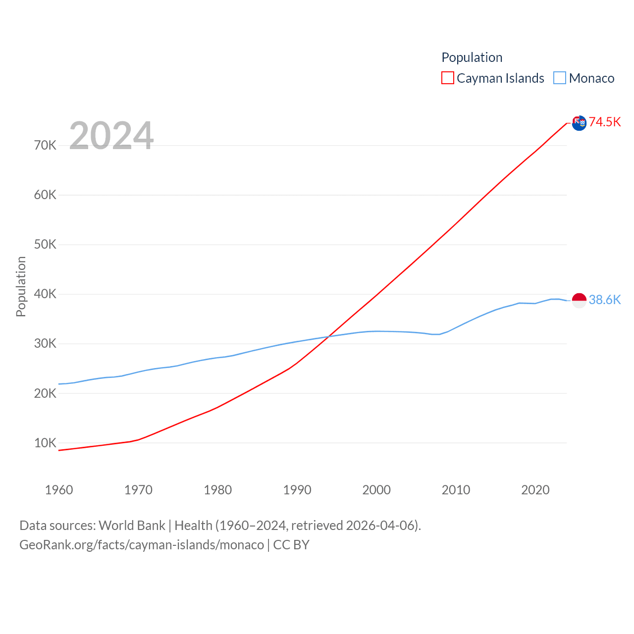 The Cayman Islands has a population of 74.5K (ranked 187/197), compared with 38.6K in Monaco (ranked 191/197). The Cayman Islands' land area is 92.7 sq mi versus 0.8 sq mi for Monaco (ranked 190th vs. 196th).