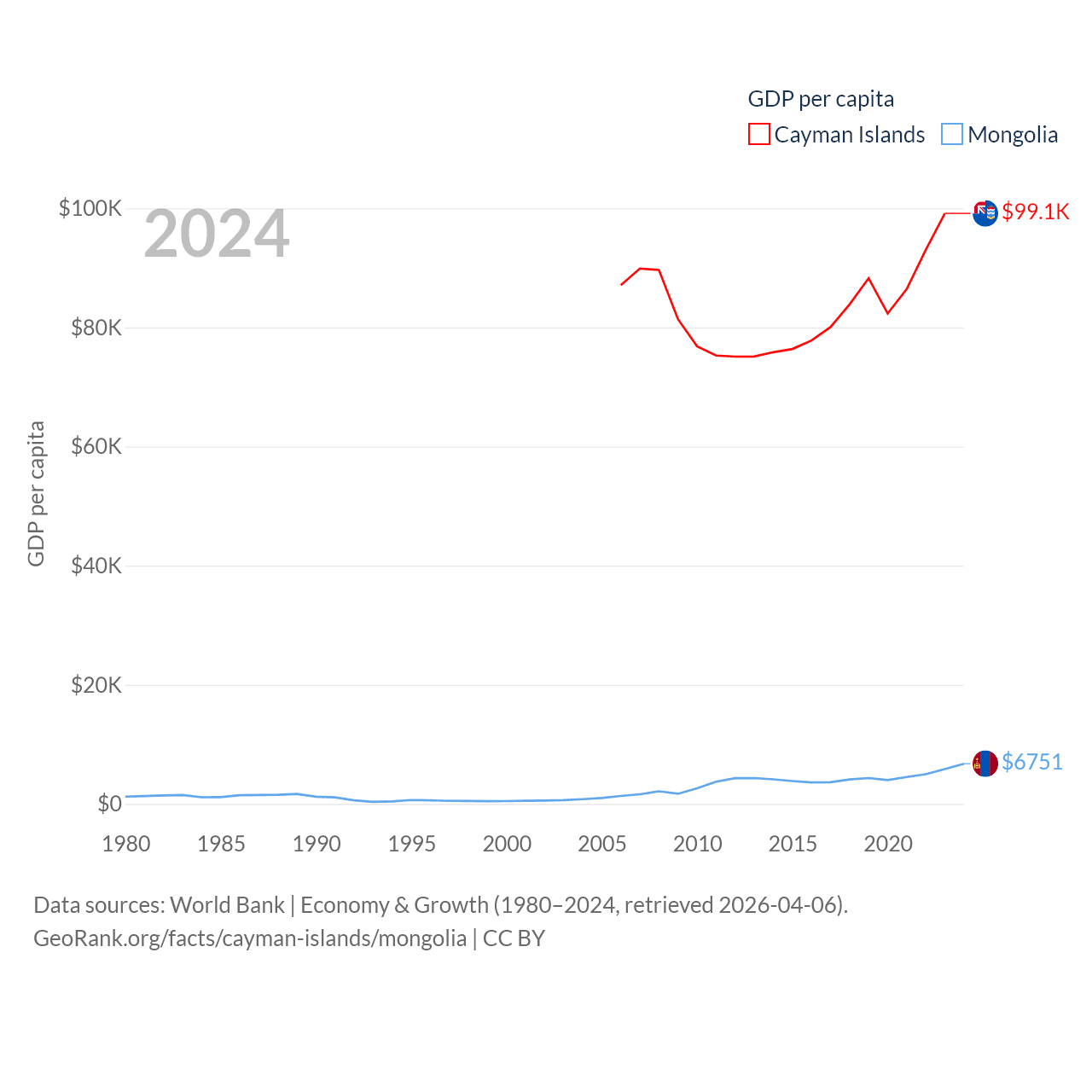 By GDP, The Cayman Islands ranks 158/197 ($7.24B) and Mongolia ranks 121/197 ($23.8B). By GDP per capita, The Cayman Islands ranks 6/197 ($99,144), while Mongolia ranks 105/197 ($6,751).