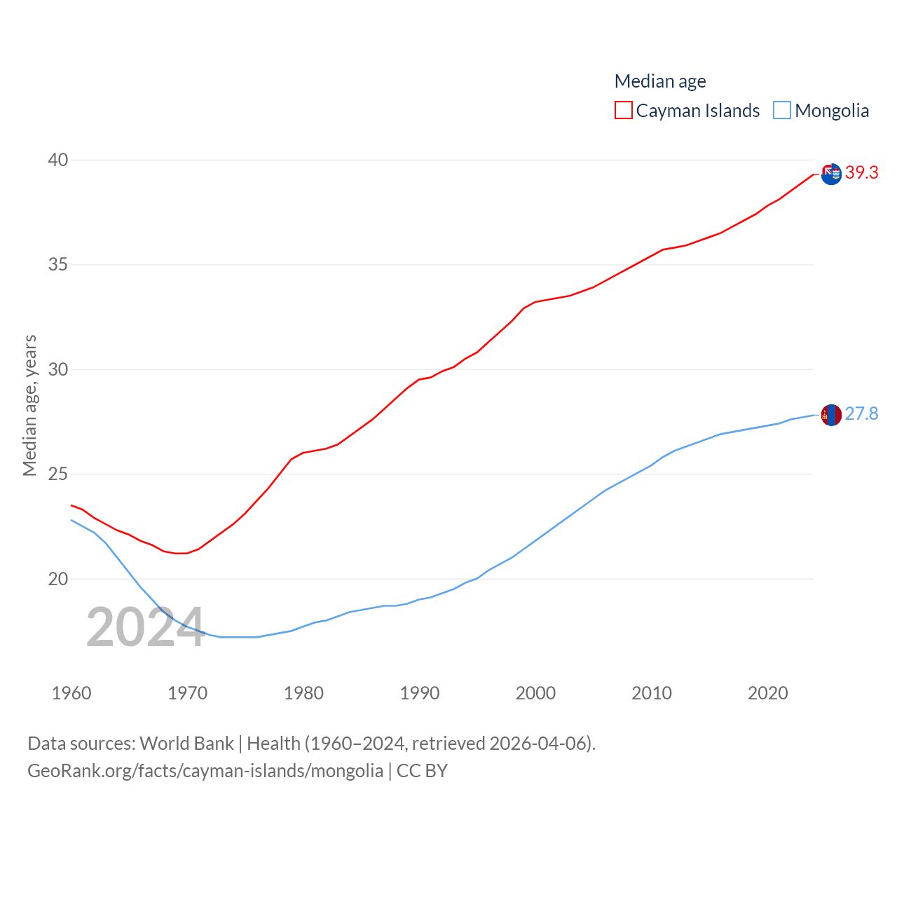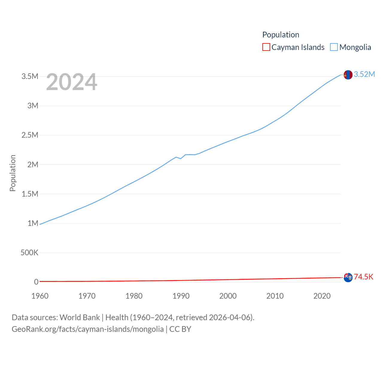 The Cayman Islands has a population of 74.5K (ranked 187/197), compared with 3.52M in Mongolia (ranked 132/197). The Cayman Islands' land area is 92.7 sq mi versus 601,740 sq mi for Mongolia (ranked 190th vs. 18th).
