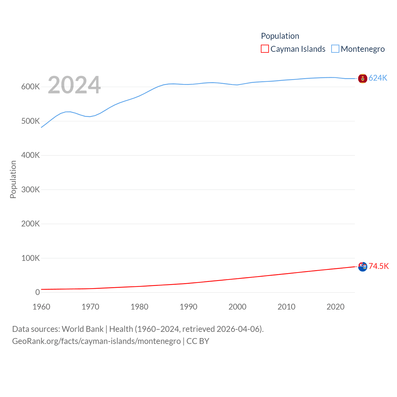 The Cayman Islands has a population of 74.5K (ranked 187/197), compared with 624K in Montenegro (ranked 166/197). The Cayman Islands' land area is 92.7 sq mi versus 5,193 sq mi for Montenegro (ranked 190th vs. 156th).