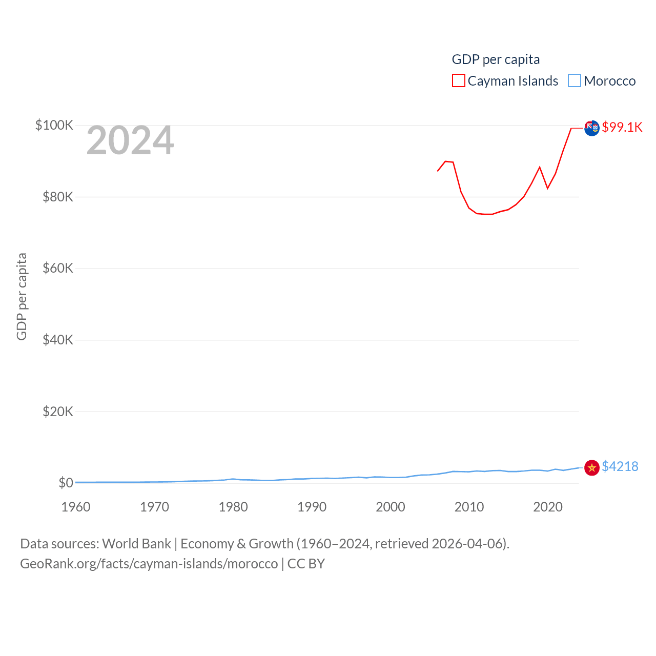 By GDP, The Cayman Islands ranks 158/197 ($7.24B) and Morocco ranks 58/197 ($161B). By GDP per capita, The Cayman Islands ranks 6/197 ($99,144), while Morocco ranks 127/197 ($4,218).