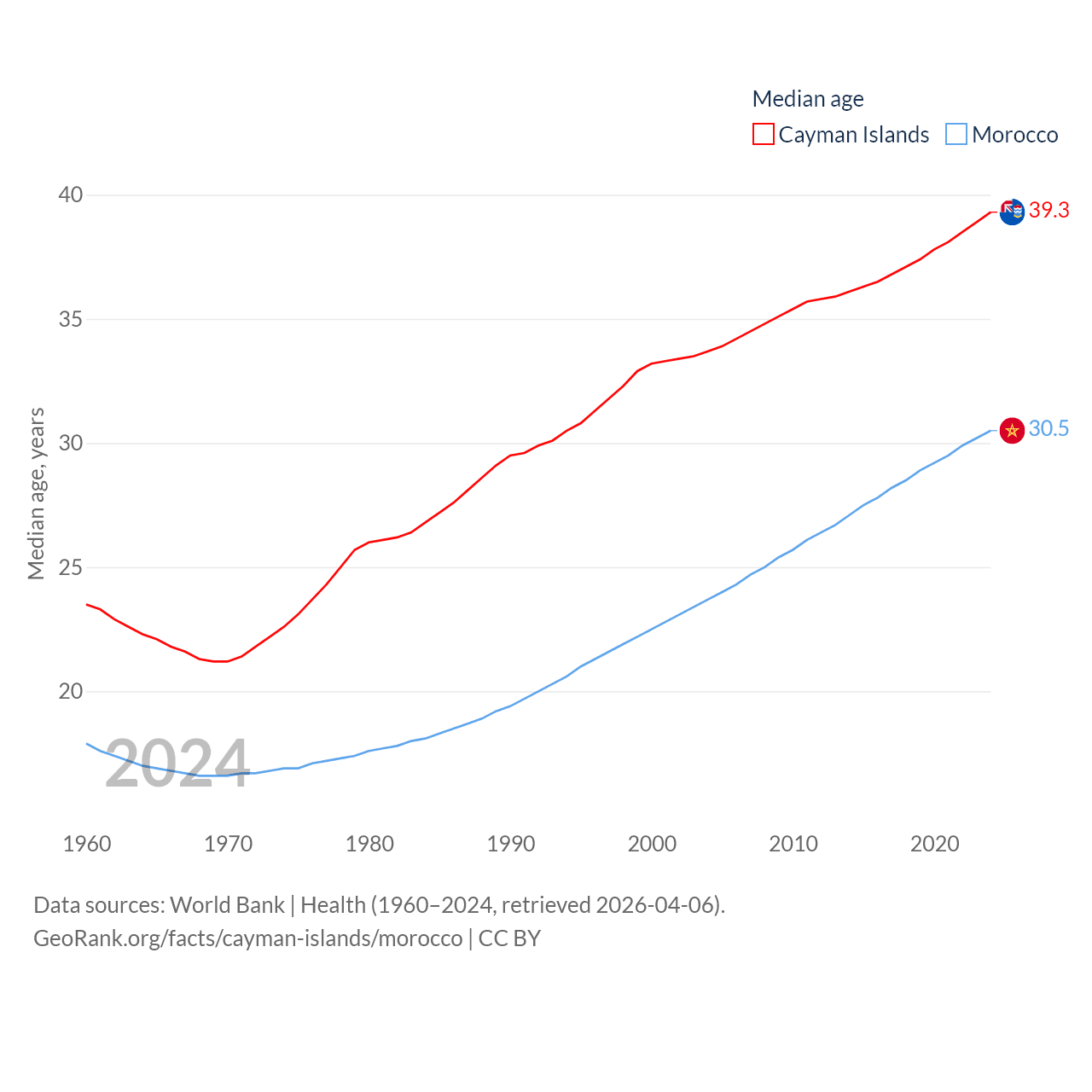The Cayman Islands has a population of 74.5K (ranked 187/197), compared with 38.1M in Morocco (ranked 39/197). The Cayman Islands' land area is 92.7 sq mi versus 172,317 sq mi for Morocco (ranked 190th vs. 55th).