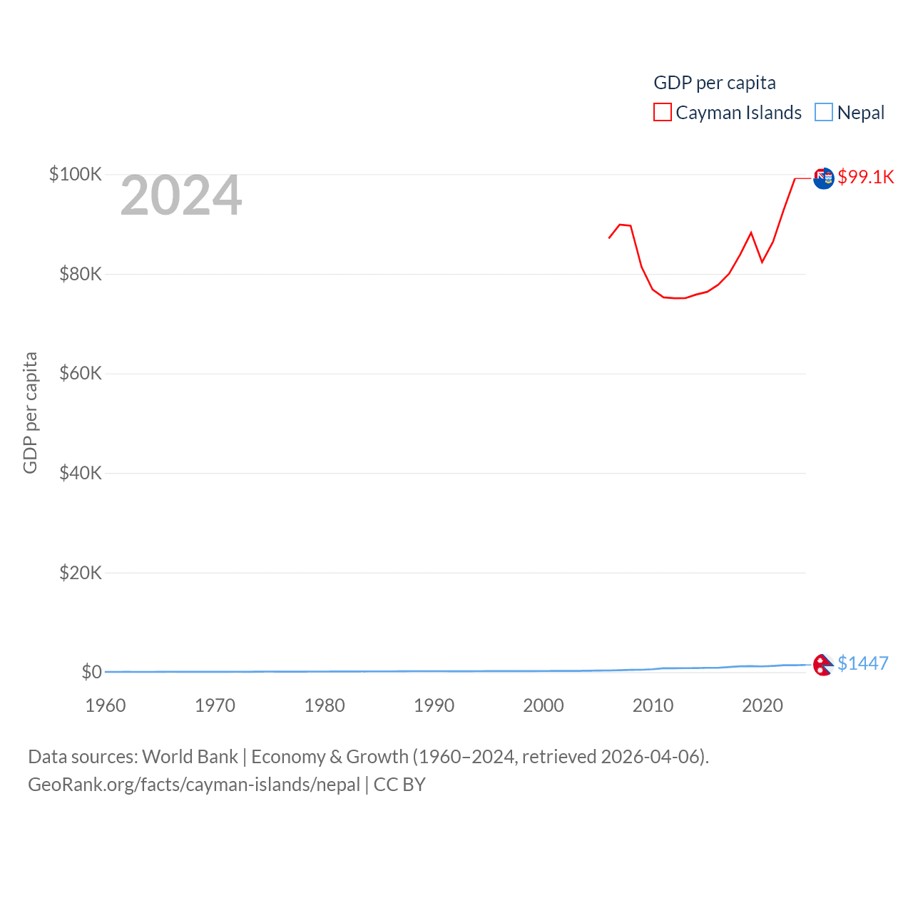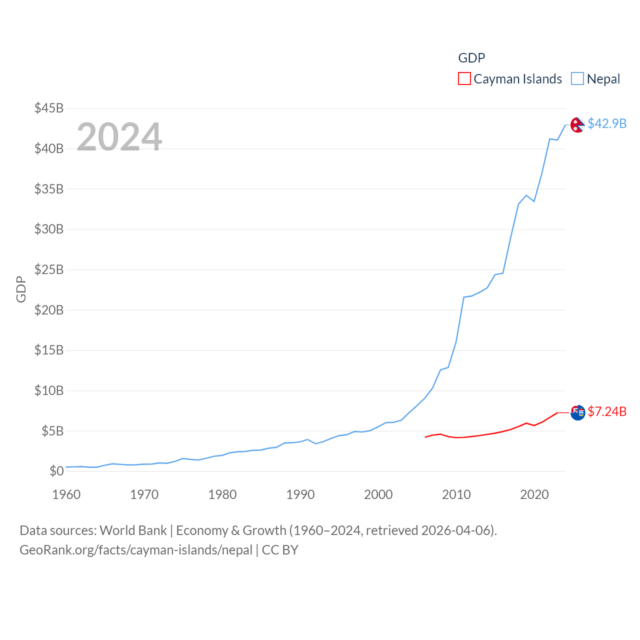 By GDP, The Cayman Islands ranks 158/197 ($7.24B) and Nepal ranks 101/197 ($42.9B). By GDP per capita, The Cayman Islands ranks 6/197 ($99,144), while Nepal ranks 164/197 ($1,447).