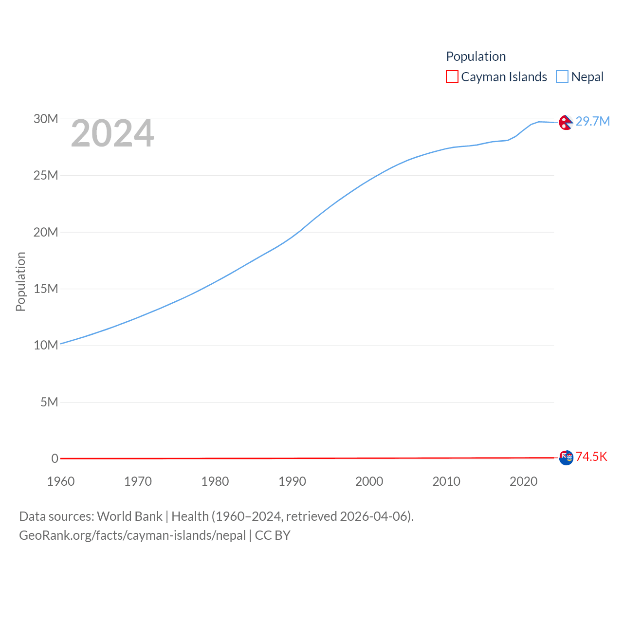 The Cayman Islands has a population of 74.5K (ranked 187/197), compared with 29.7M in Nepal (ranked 51/197). The Cayman Islands' land area is 92.7 sq mi versus 55,348 sq mi for Nepal (ranked 190th vs. 92nd).