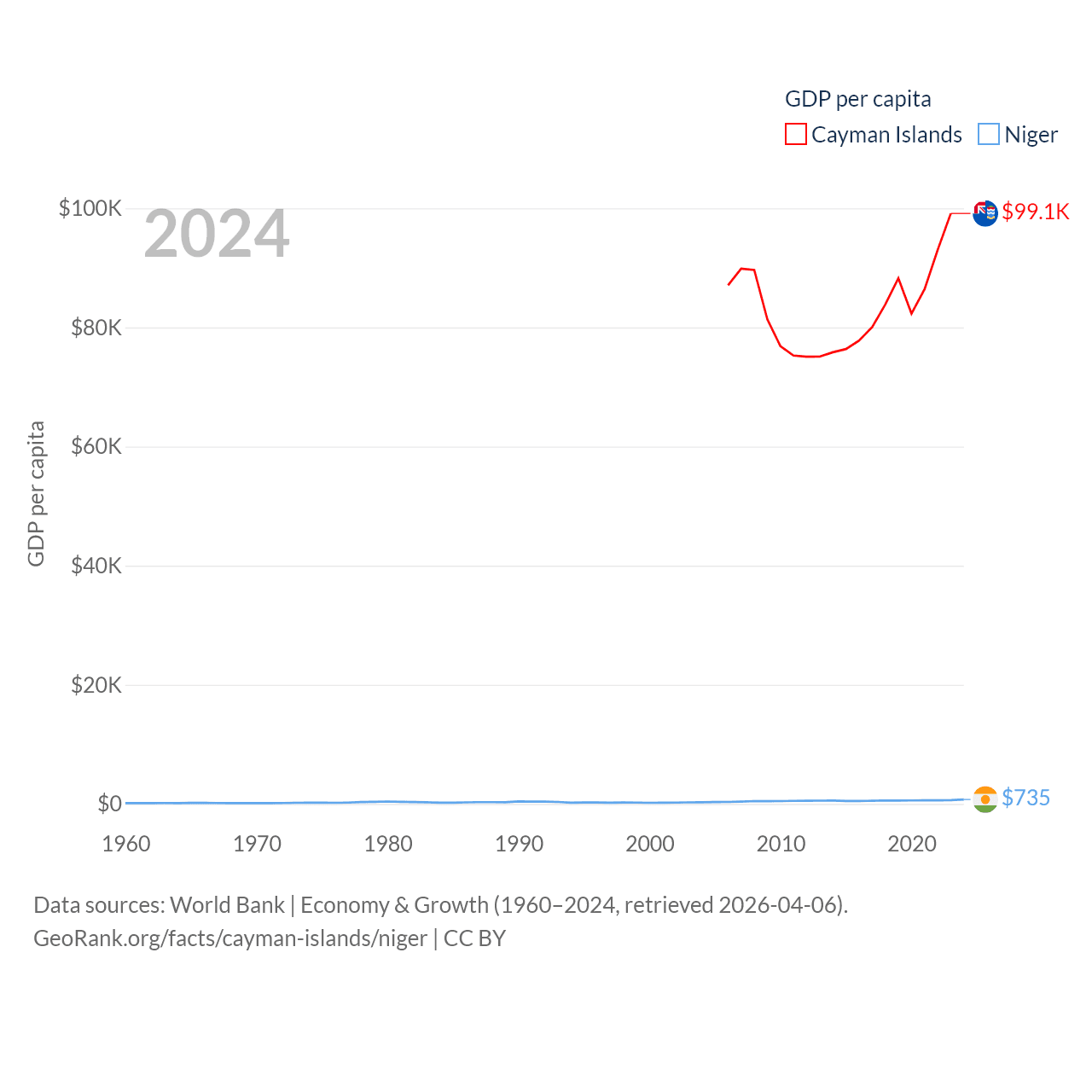 By GDP, The Cayman Islands ranks 158/197 ($7.24B) and Niger ranks 130/197 ($19.9B). By GDP per capita, The Cayman Islands ranks 6/197 ($99,144), while Niger ranks 187/197 ($735).