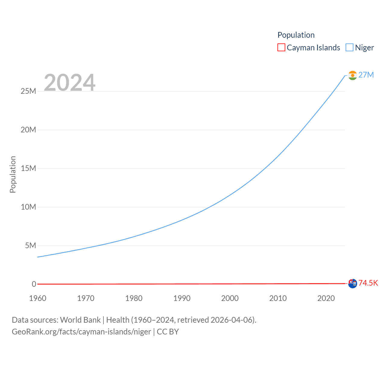 The Cayman Islands has a population of 74.5K (ranked 187/197), compared with 27M in Niger (ranked 55/197). The Cayman Islands' land area is 92.7 sq mi versus 489,076 sq mi for Niger (ranked 190th vs. 20th).