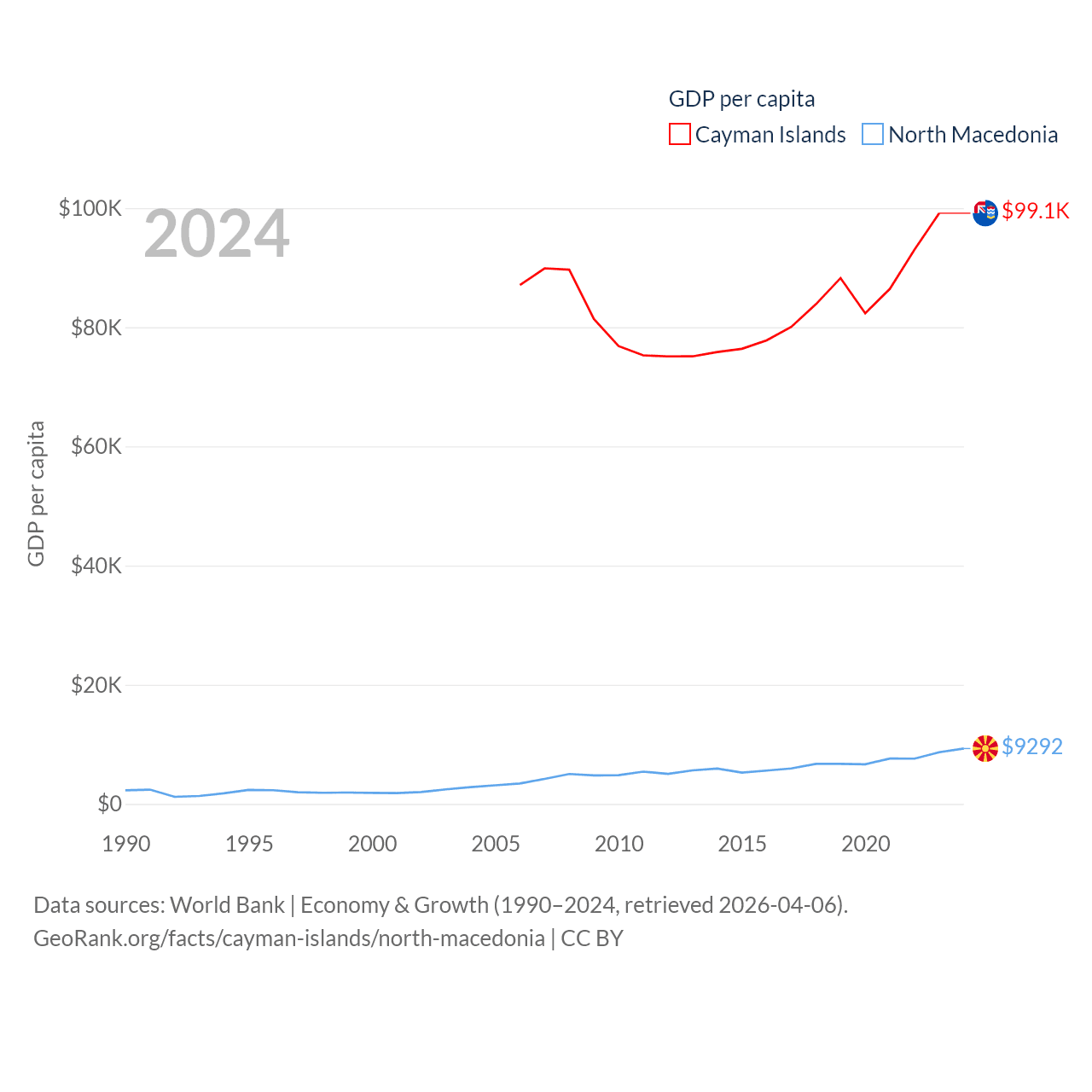 By GDP, The Cayman Islands ranks 158/197 ($7.24B) and North Macedonia ranks 138/197 ($17B). By GDP per capita, The Cayman Islands ranks 6/197 ($99,144), while North Macedonia ranks 88/197 ($9,292).