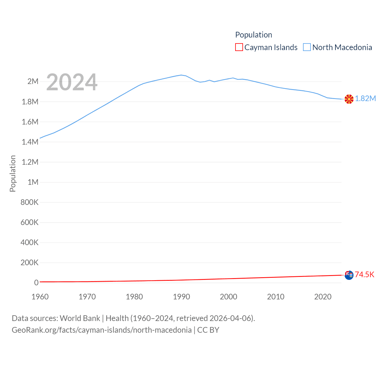 The Cayman Islands has a population of 74.5K (ranked 187/197), compared with 1.82M in North Macedonia (ranked 150/197). The Cayman Islands' land area is 92.7 sq mi versus 9,737 sq mi for North Macedonia (ranked 190th vs. 145th).