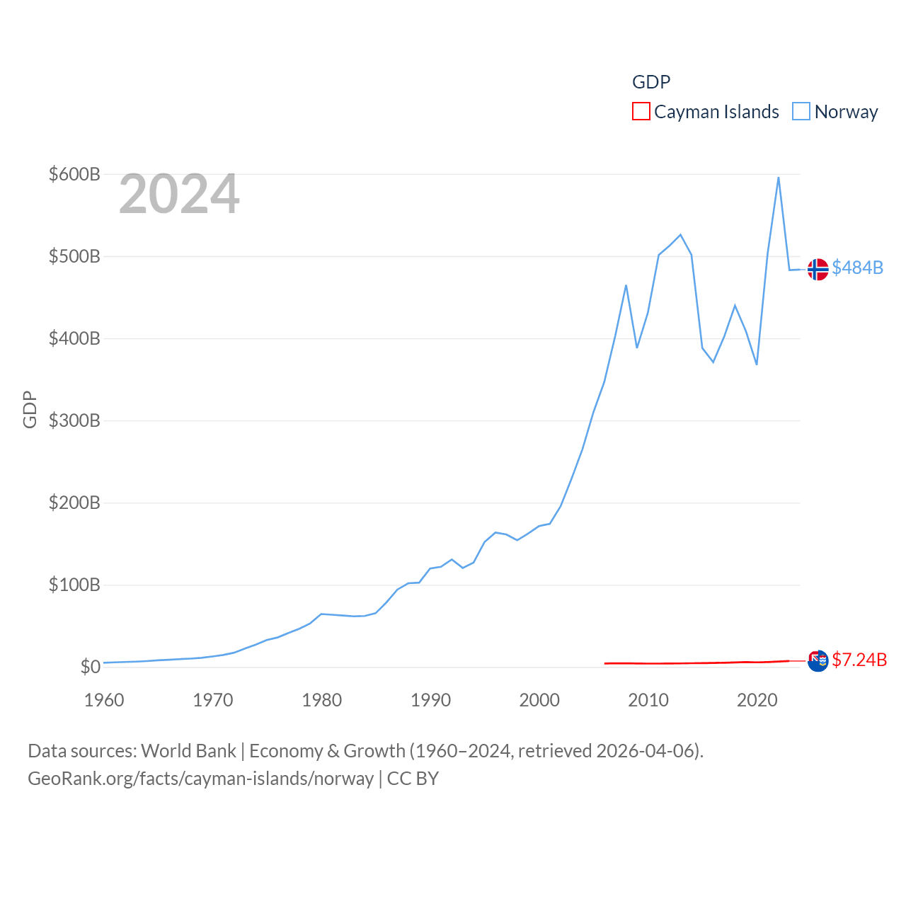 By GDP, The Cayman Islands ranks 158/197 ($7.24B) and Norway ranks 32/197 ($484B). By GDP per capita, The Cayman Islands ranks 6/197 ($99,144), while Norway ranks 8/197 ($86,785).