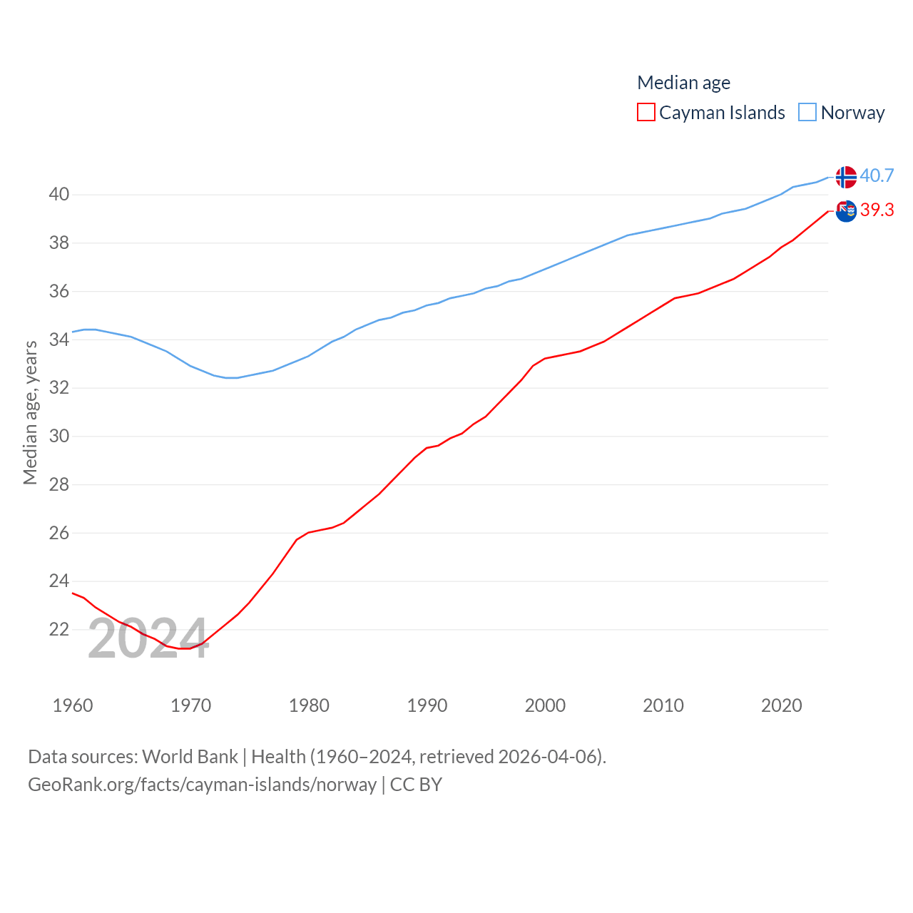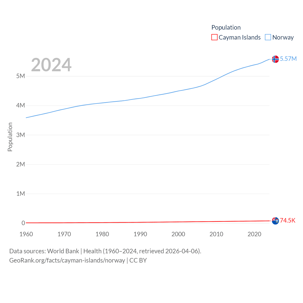 The Cayman Islands has a population of 74.5K (ranked 187/197), compared with 5.57M in Norway (ranked 118/197). The Cayman Islands' land area is 92.7 sq mi versus 140,645 sq mi for Norway (ranked 190th vs. 62nd).