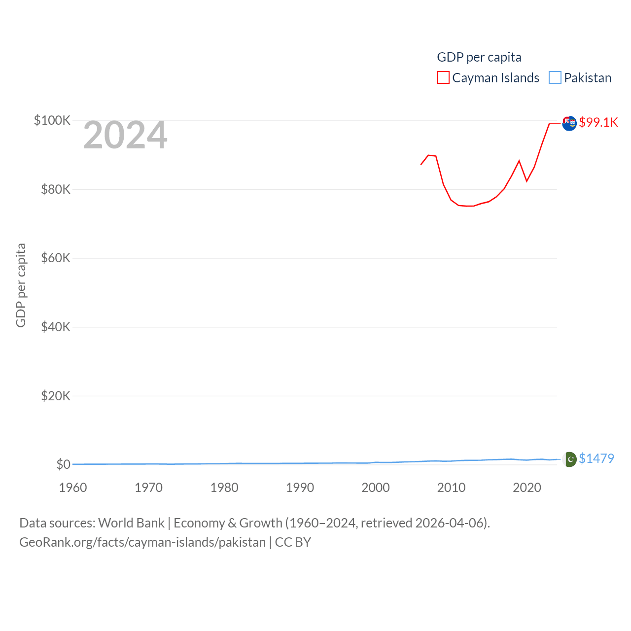 By GDP, The Cayman Islands ranks 158/197 ($7.24B) and Pakistan ranks 43/197 ($372B). By GDP per capita, The Cayman Islands ranks 6/197 ($99,144), while Pakistan ranks 163/197 ($1,479).
