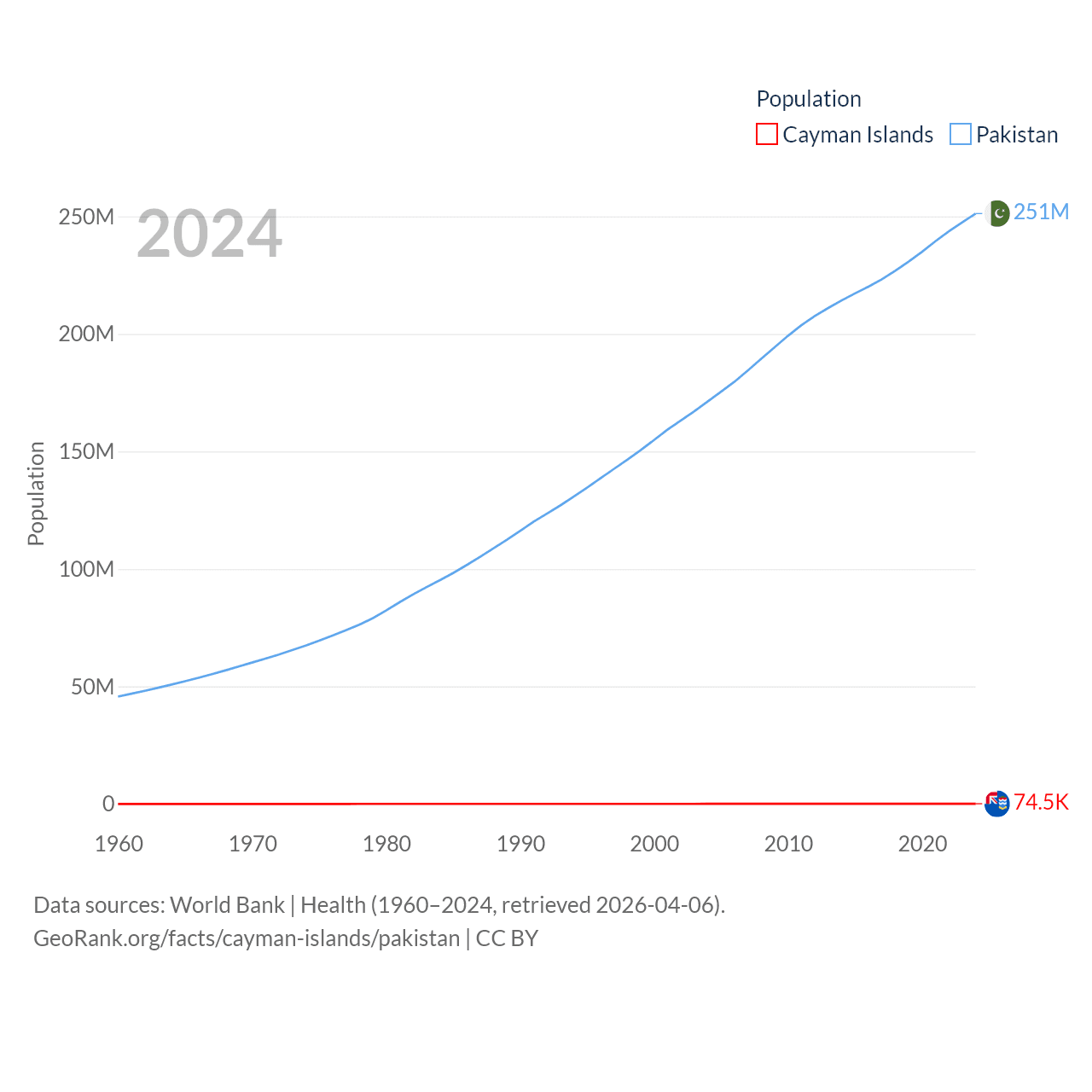 The Cayman Islands has a population of 74.5K (ranked 187/197), compared with 251M in Pakistan (ranked 5/197). The Cayman Islands' land area is 92.7 sq mi versus 297,638 sq mi for Pakistan (ranked 190th vs. 35th).
