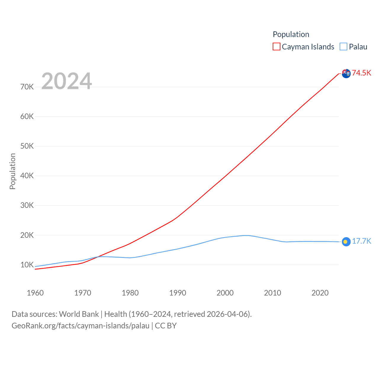 The Cayman Islands has a population of 74.5K (ranked 187/197), compared with 17.7K in Palau (ranked 194/197). The Cayman Islands' land area is 92.7 sq mi versus 177.6 sq mi for Palau (ranked 190th vs. 180th).