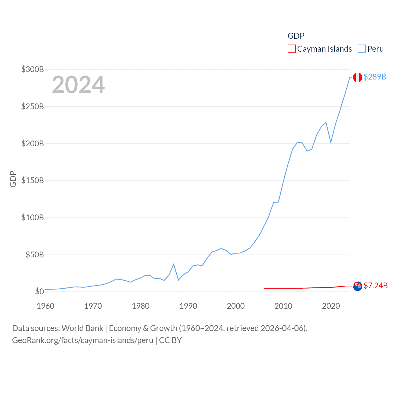 By GDP, The Cayman Islands ranks 158/197 ($7.24B) and Peru ranks 49/197 ($289B). By GDP per capita, The Cayman Islands ranks 6/197 ($99,144), while Peru ranks 91/197 ($8,452).