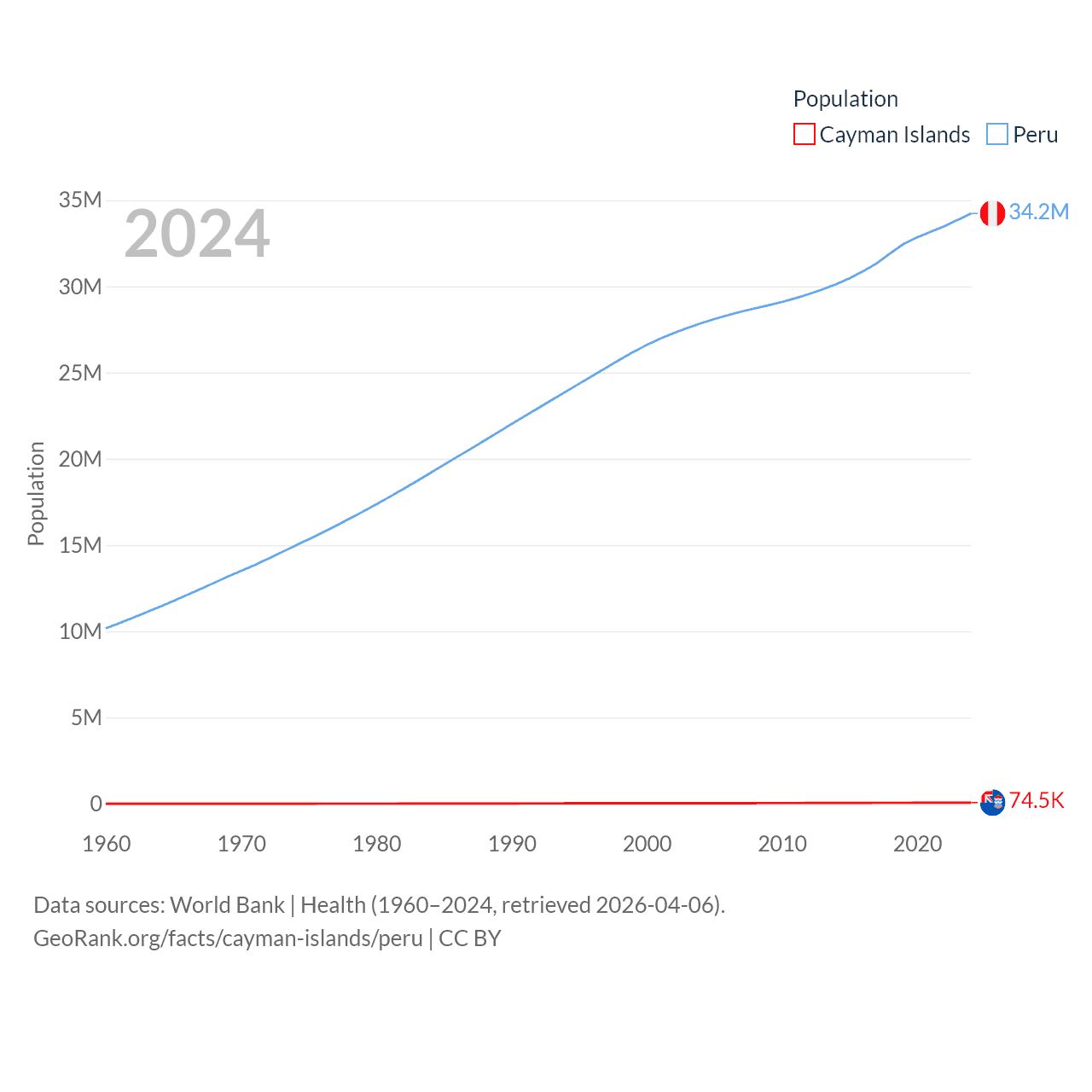 The Cayman Islands has a population of 74.5K (ranked 187/197), compared with 34.2M in Peru (ranked 48/197). The Cayman Islands' land area is 92.7 sq mi versus 494,211 sq mi for Peru (ranked 190th vs. 19th).
