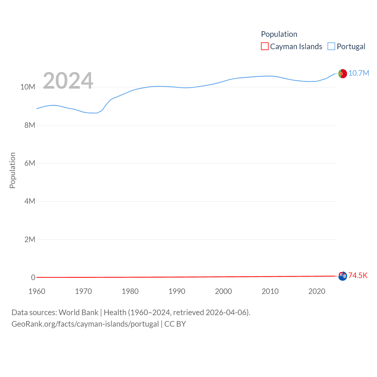 The Cayman Islands has a population of 74.5K (ranked 187/197), compared with 10.7M in Portugal (ranked 90/197). The Cayman Islands' land area is 92.7 sq mi versus 35,369 sq mi for Portugal (ranked 190th vs. 108th).