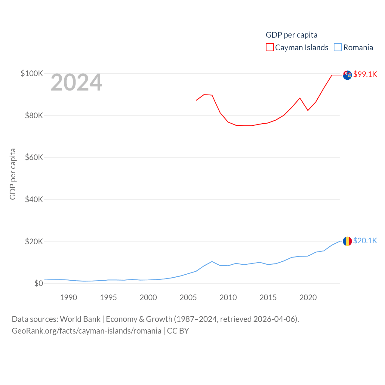 By GDP, The Cayman Islands ranks 158/197 ($7.24B) and Romania ranks 42/197 ($383B). By GDP per capita, The Cayman Islands ranks 6/197 ($99,144), while Romania ranks 58/197 ($20,080).