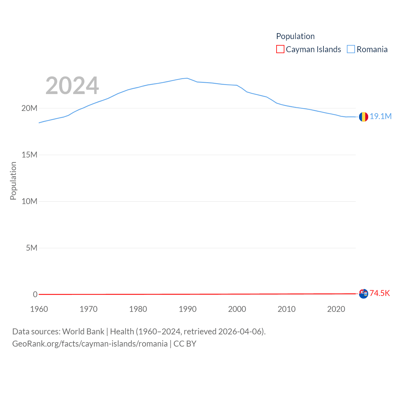 The Cayman Islands has a population of 74.5K (ranked 187/197), compared with 19.1M in Romania (ranked 67/197). The Cayman Islands' land area is 92.7 sq mi versus 88,834 sq mi for Romania (ranked 190th vs. 80th).