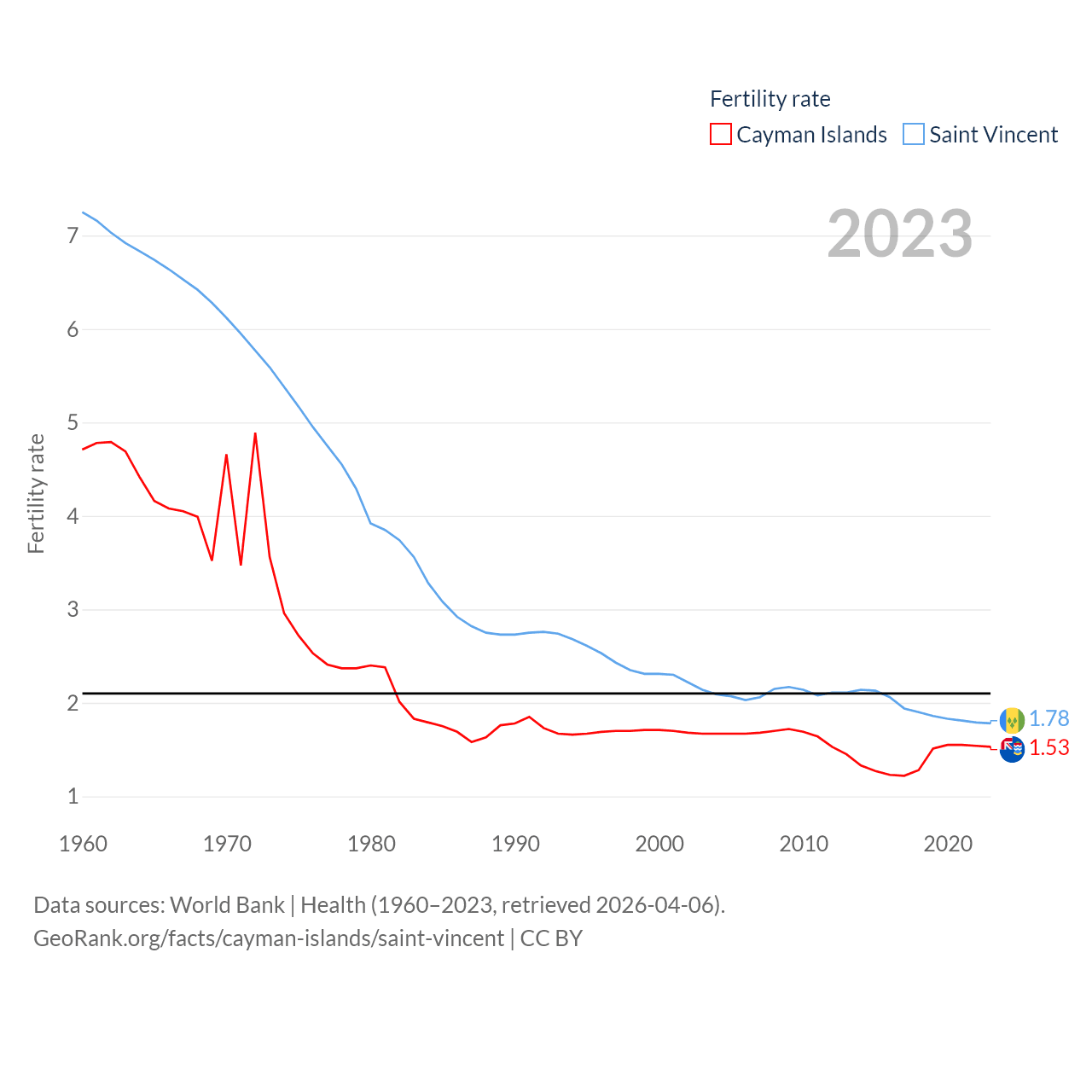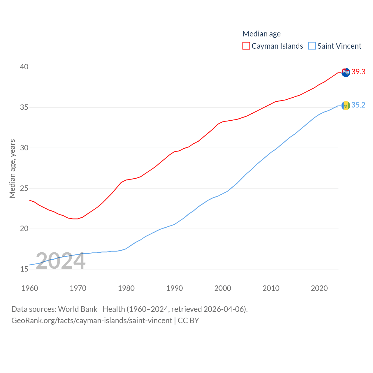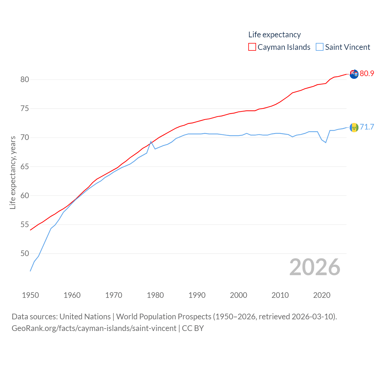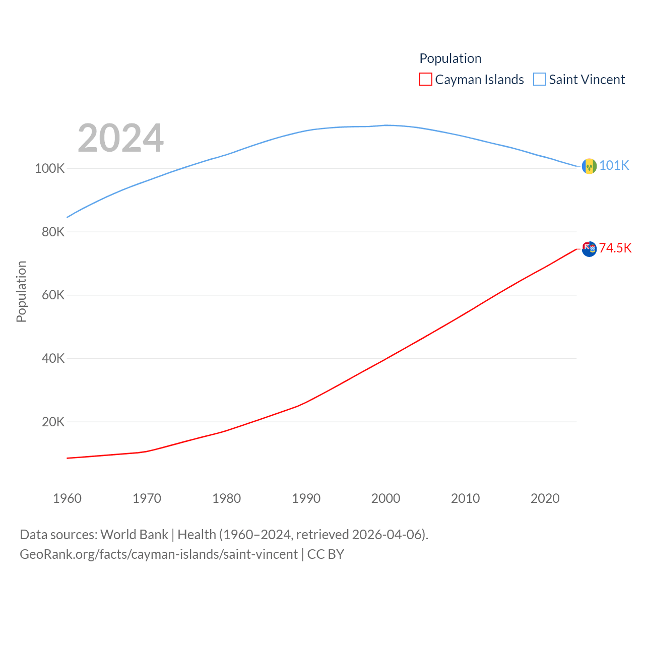 The Cayman Islands has a population of 74.5K (ranked 187/197), compared with 101K in Saint Vincent (ranked 184/197). The Cayman Islands' land area is 92.7 sq mi versus 150.6 sq mi for Saint Vincent (ranked 190th vs. 185th).