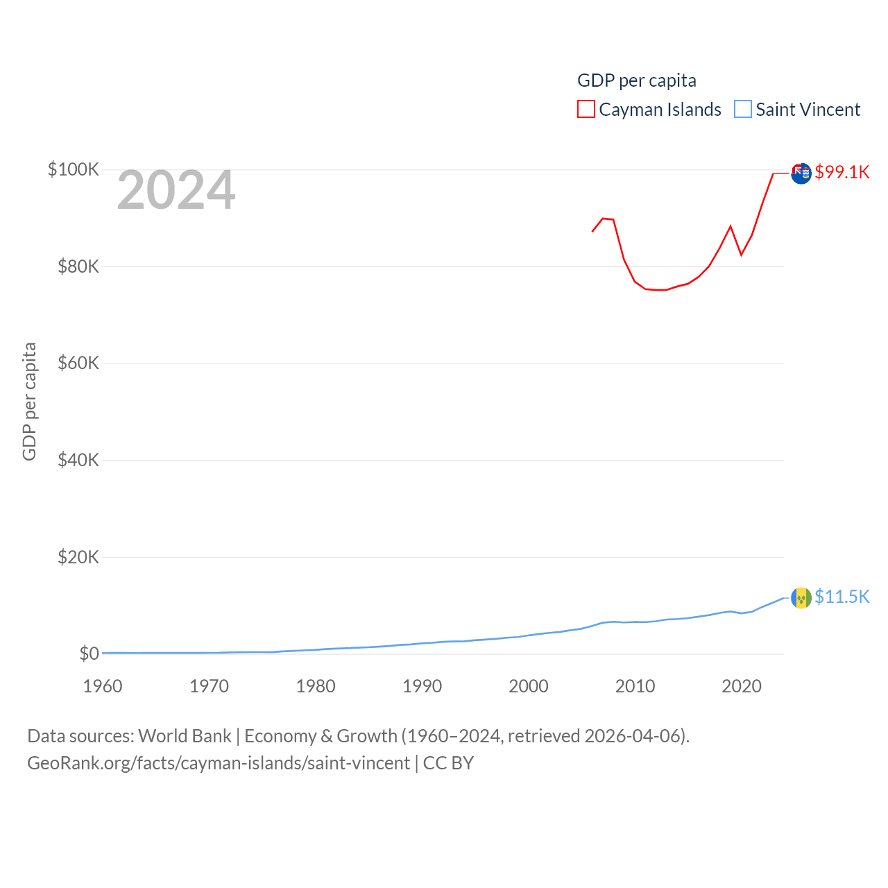 By GDP, The Cayman Islands ranks 158/197 ($7.24B) and Saint Vincent ranks 186/197 ($1.16B). By GDP per capita, The Cayman Islands ranks 6/197 ($99,144), while Saint Vincent ranks 81/197 ($11,501).