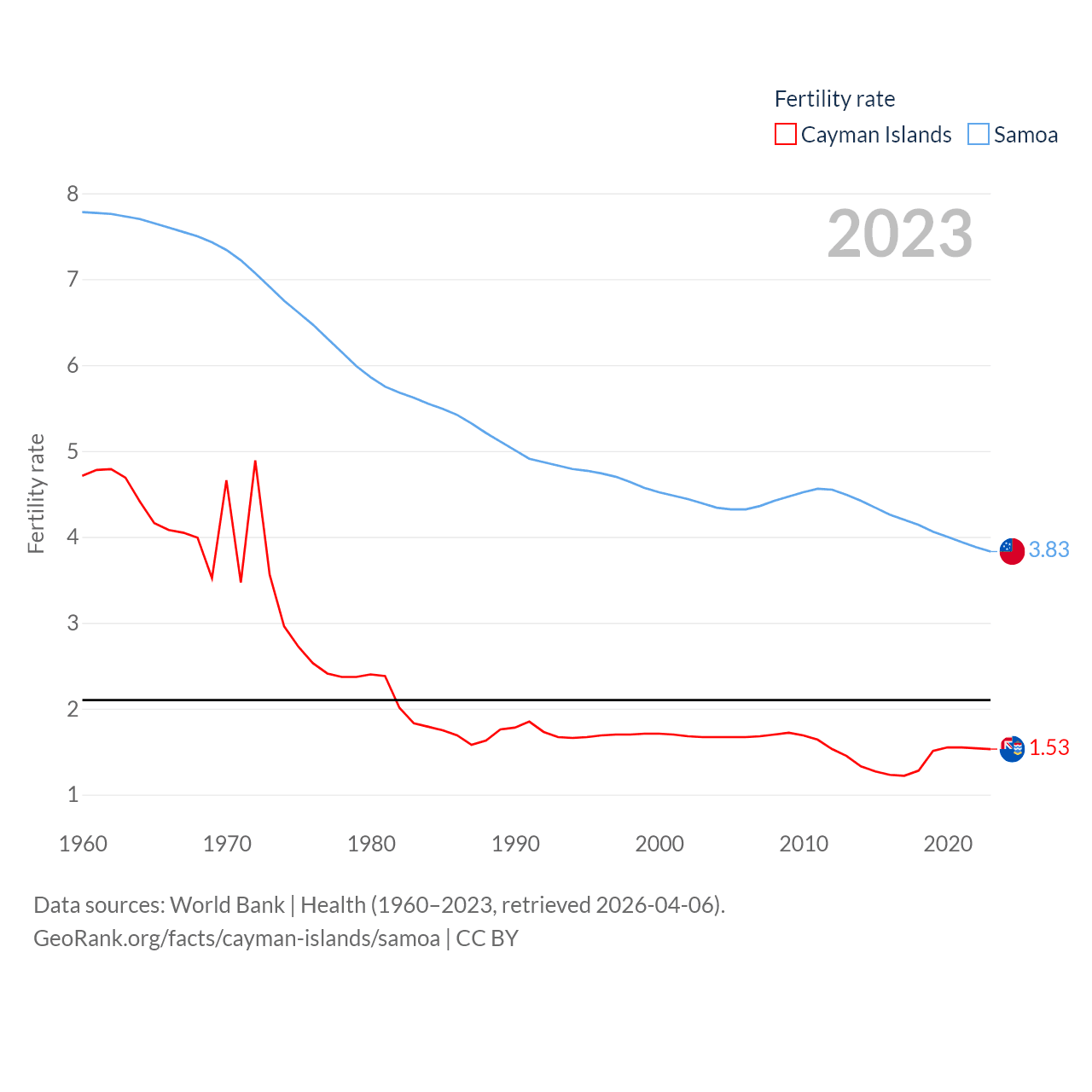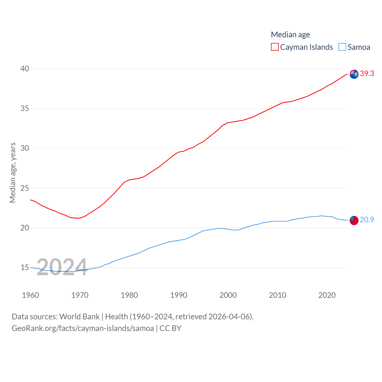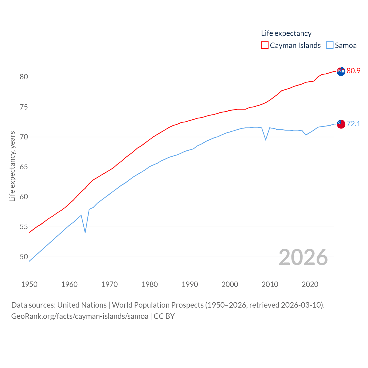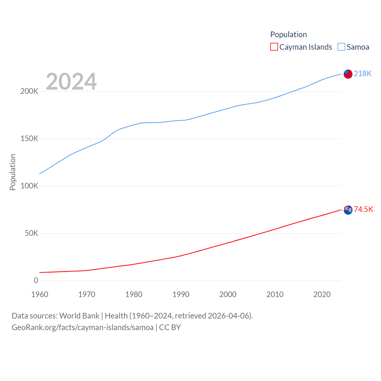 The Cayman Islands has a population of 74.5K (ranked 187/197), compared with 218K in Samoa (ranked 177/197). The Cayman Islands' land area is 92.7 sq mi versus 1,073 sq mi for Samoa (ranked 190th vs. 168th).