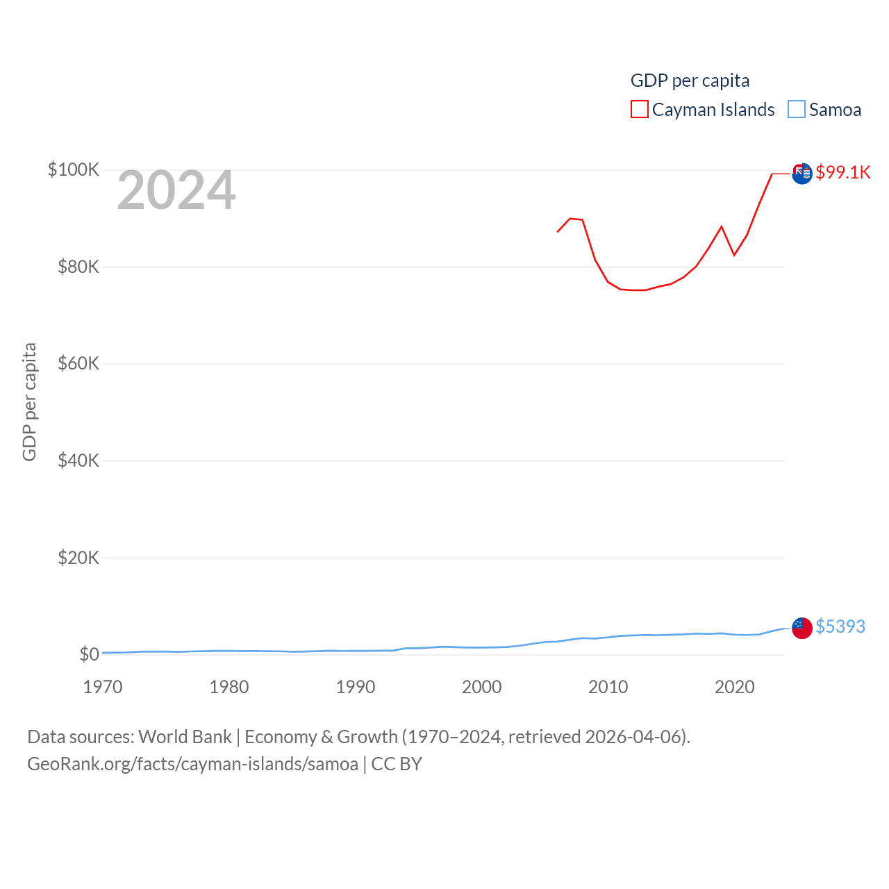 By GDP, The Cayman Islands ranks 158/197 ($7.24B) and Samoa ranks 185/197 ($1.18B). By GDP per capita, The Cayman Islands ranks 6/197 ($99,144), while Samoa ranks 117/197 ($5,393).
