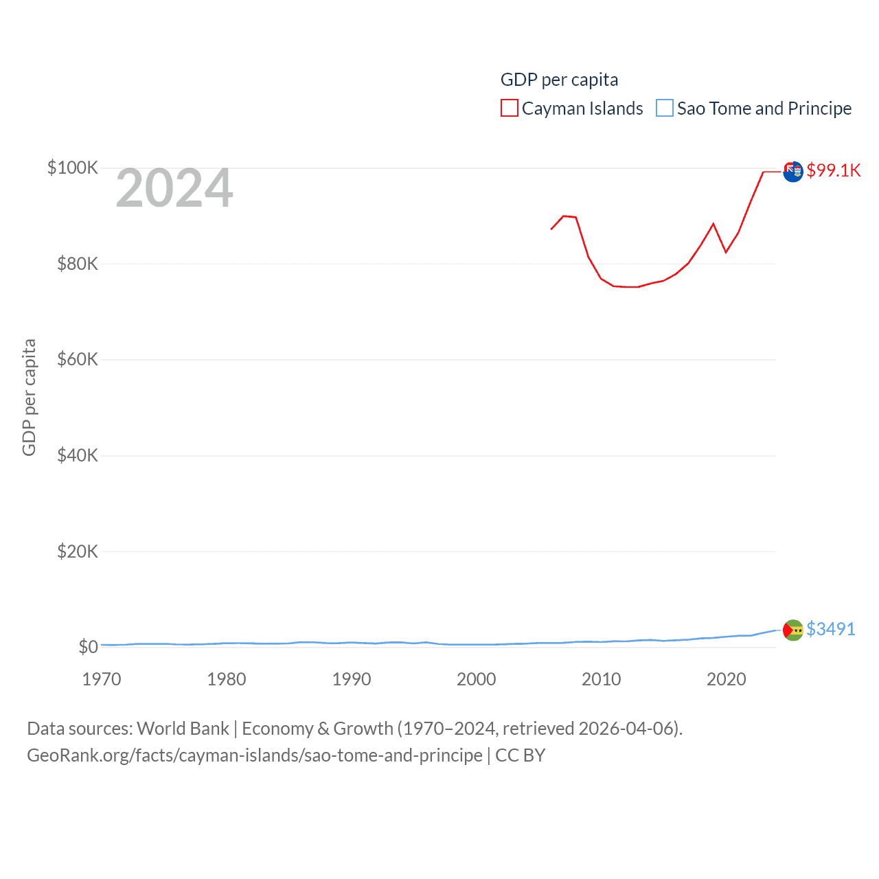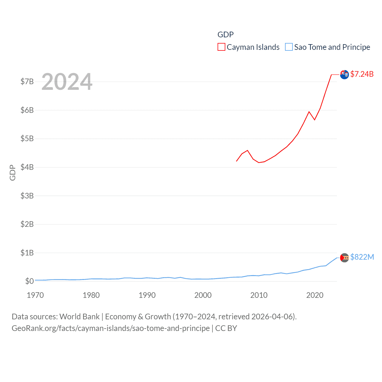 By GDP, The Cayman Islands ranks 158/197 ($7.24B) and Sao Tome and Principe ranks 189/197 ($822M). By GDP per capita, The Cayman Islands ranks 6/197 ($99,144), while Sao Tome and Principe ranks 134/197 ($3,491).