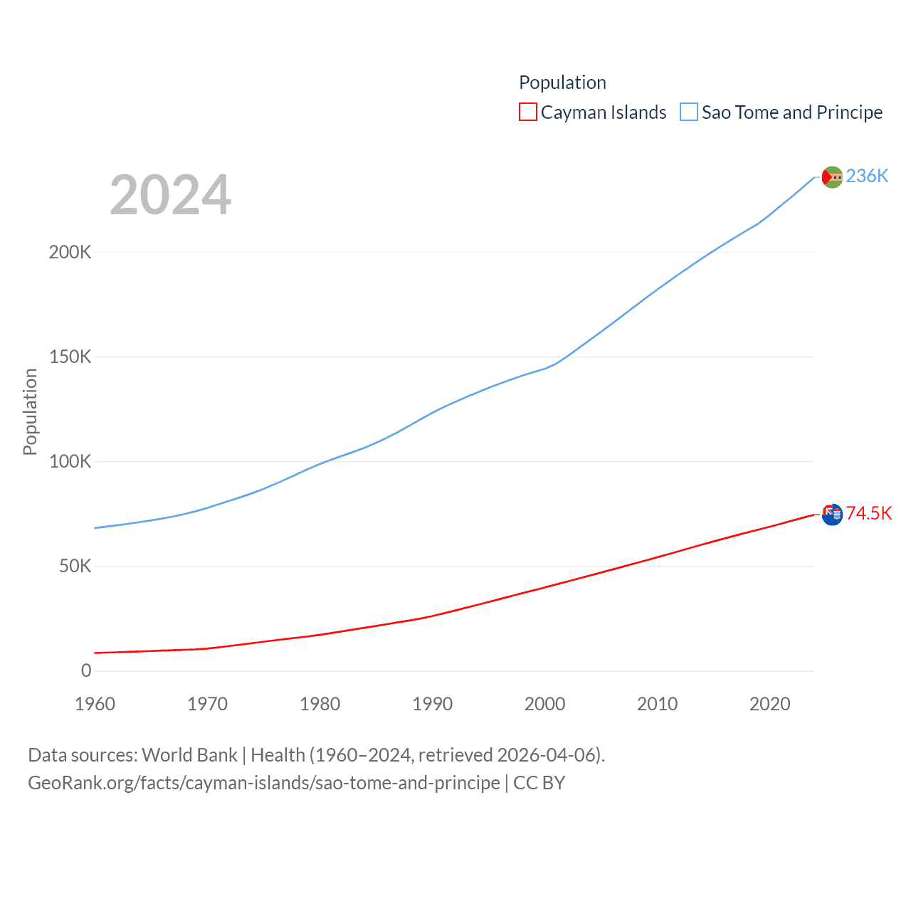 The Cayman Islands has a population of 74.5K (ranked 187/197), compared with 236K in Sao Tome and Principe (ranked 176/197). The Cayman Islands' land area is 92.7 sq mi versus 371 sq mi for Sao Tome and Principe (ranked 190th vs. 172nd).