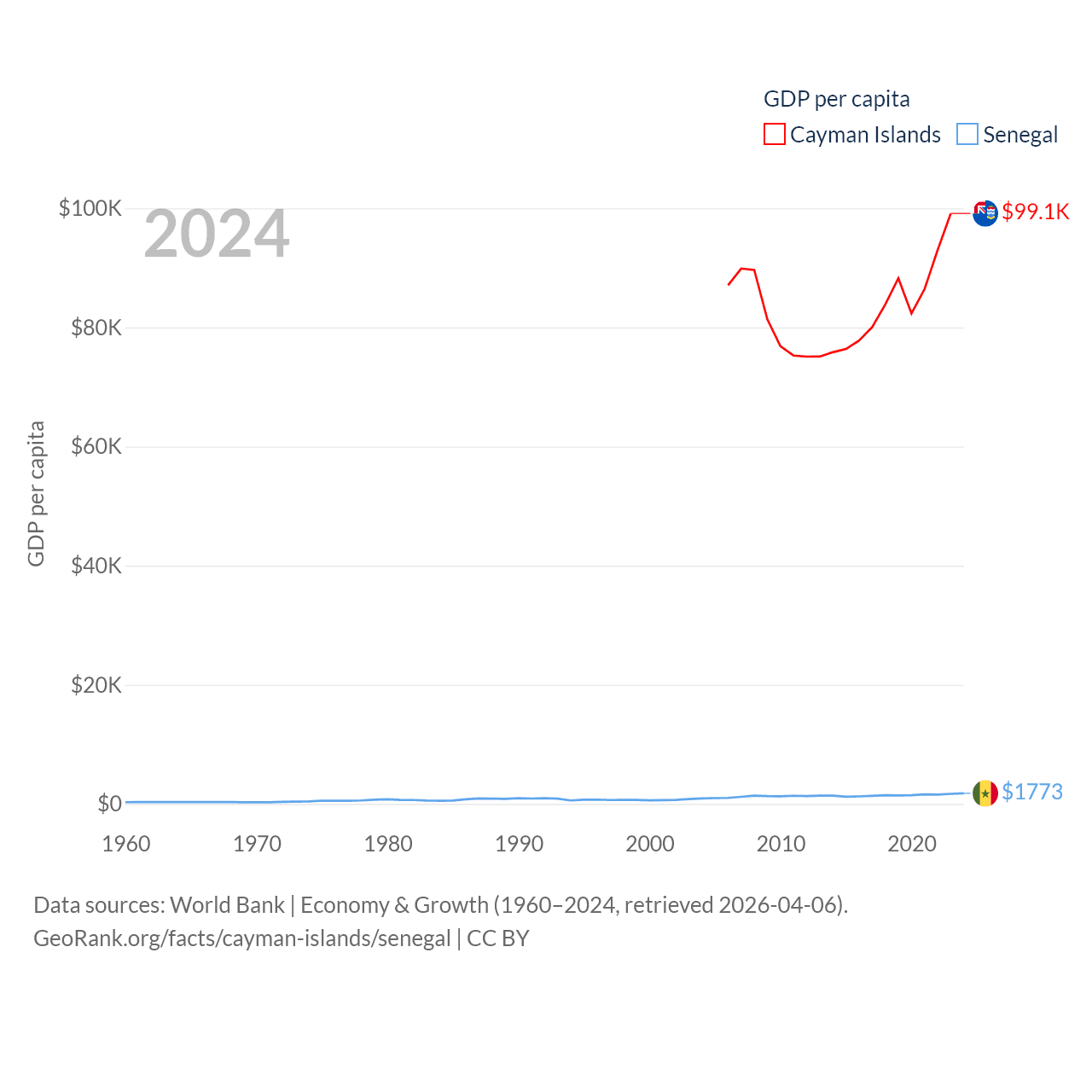By GDP, The Cayman Islands ranks 158/197 ($7.24B) and Senegal ranks 109/197 ($32.8B). By GDP per capita, The Cayman Islands ranks 6/197 ($99,144), while Senegal ranks 159/197 ($1,773).