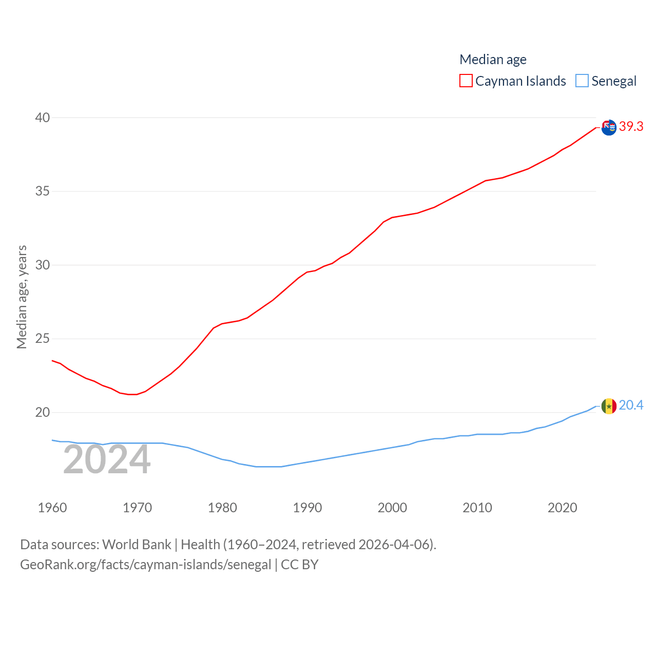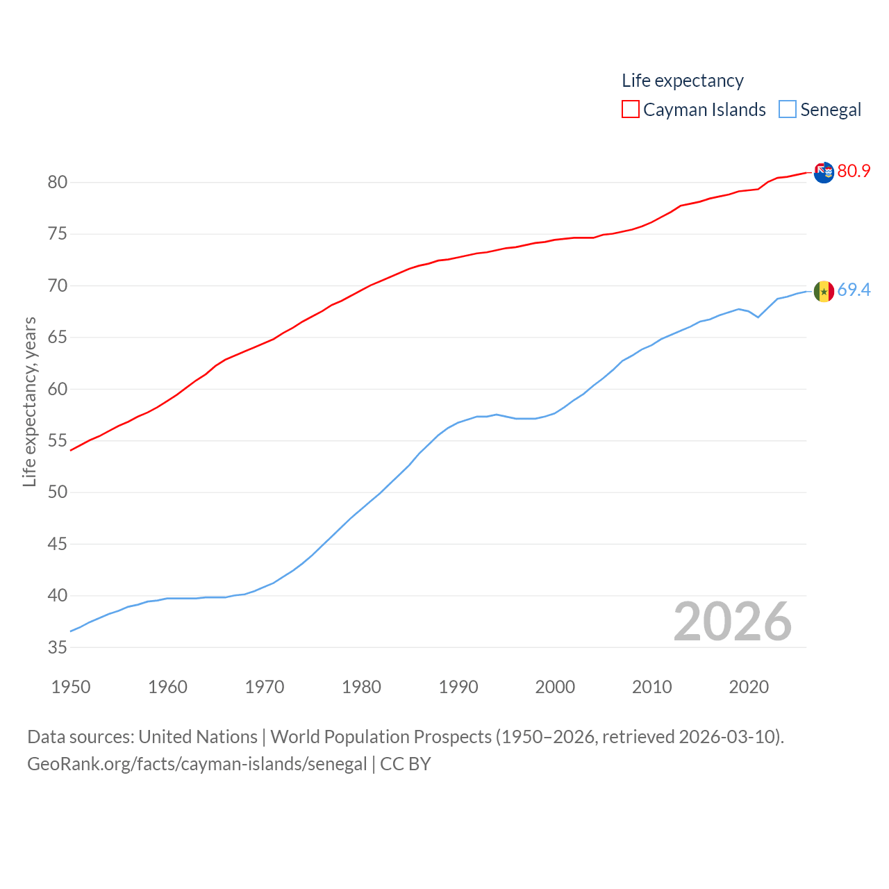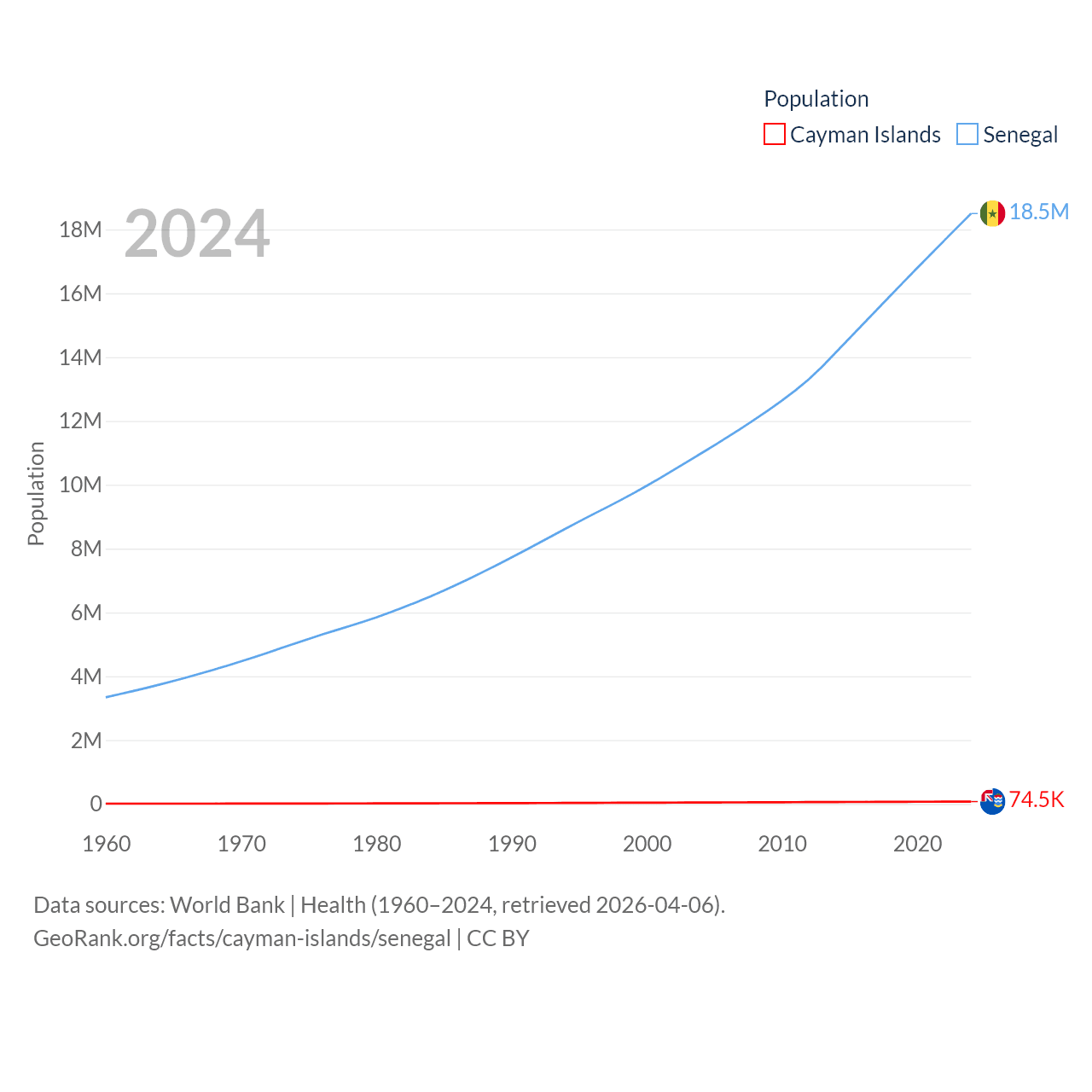 The Cayman Islands has a population of 74.5K (ranked 187/197), compared with 18.5M in Senegal (ranked 69/197). The Cayman Islands' land area is 92.7 sq mi versus 74,336 sq mi for Senegal (ranked 190th vs. 85th).
