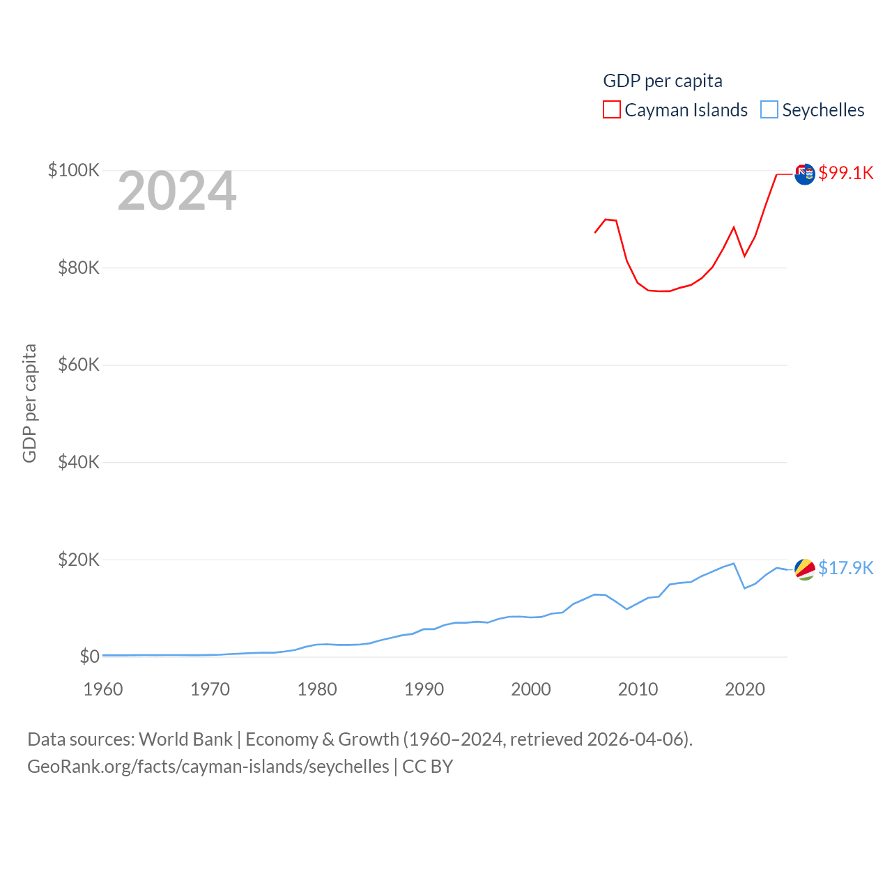 By GDP, The Cayman Islands ranks 158/197 ($7.24B) and The Seychelles ranks 178/197 ($2.17B). By GDP per capita, The Cayman Islands ranks 6/197 ($99,144), while The Seychelles ranks 63/197 ($17,859).