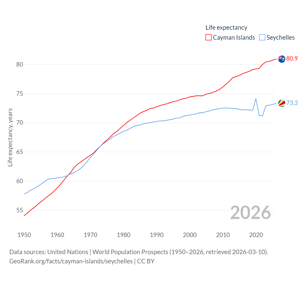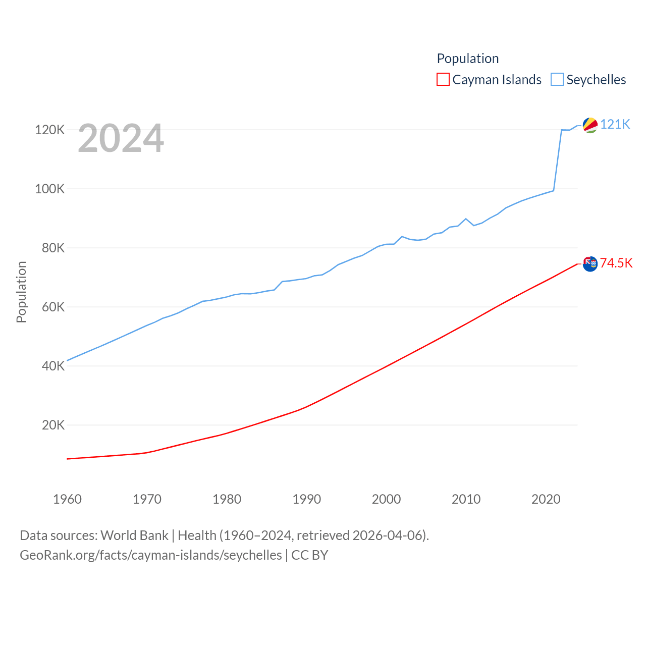 The Cayman Islands has a population of 74.5K (ranked 187/197), compared with 121K in The Seychelles (ranked 181/197). The Cayman Islands' land area is 92.7 sq mi versus 177.6 sq mi for The Seychelles (ranked 190th vs. 181st).