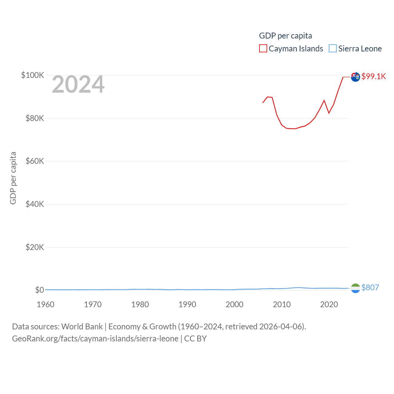 By GDP, The Cayman Islands ranks 158/197 ($7.24B) and Sierra Leone ranks 160/197 ($6.97B). By GDP per capita, The Cayman Islands ranks 6/197 ($99,144), while Sierra Leone ranks 186/197 ($807).